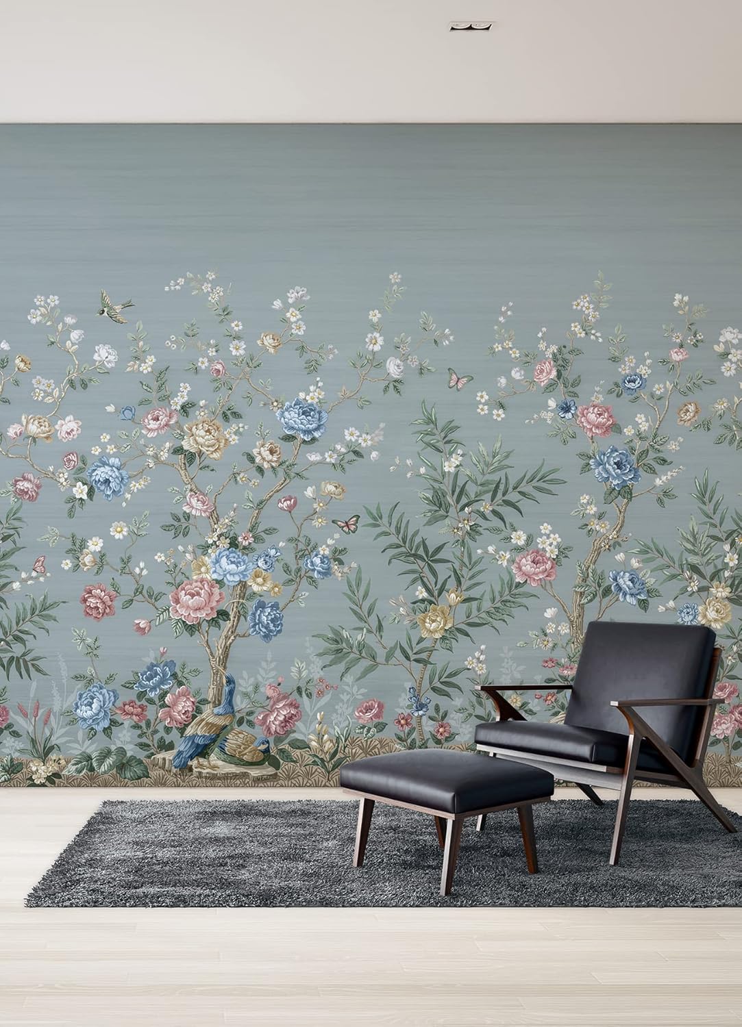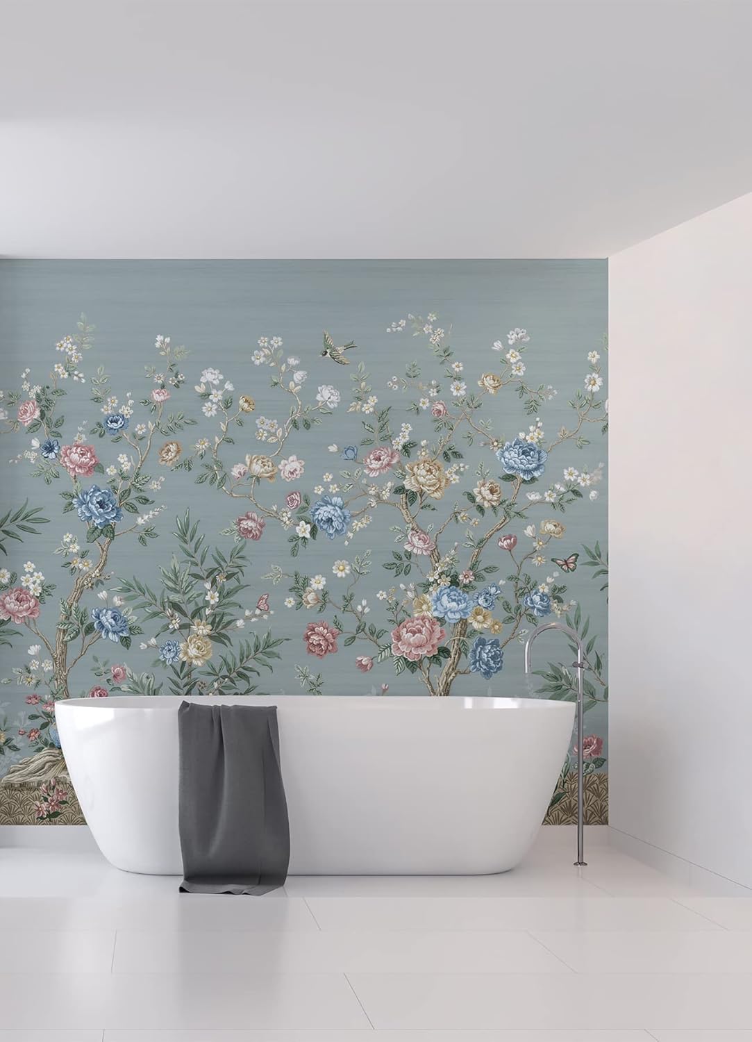 Timeless chinoiserie elegance has been reimagined in a celebration of color and natural beauty. The grove of flowering trees sports a variety of winged visitors and pastel blooms, all framed by a pale blue backdrop. Winter Chinoiserie Robin's Egg Blue Wall Mural comes on 5 panels and measures 11-ft 3-in wide by 10-ft 2-in long when assembled.