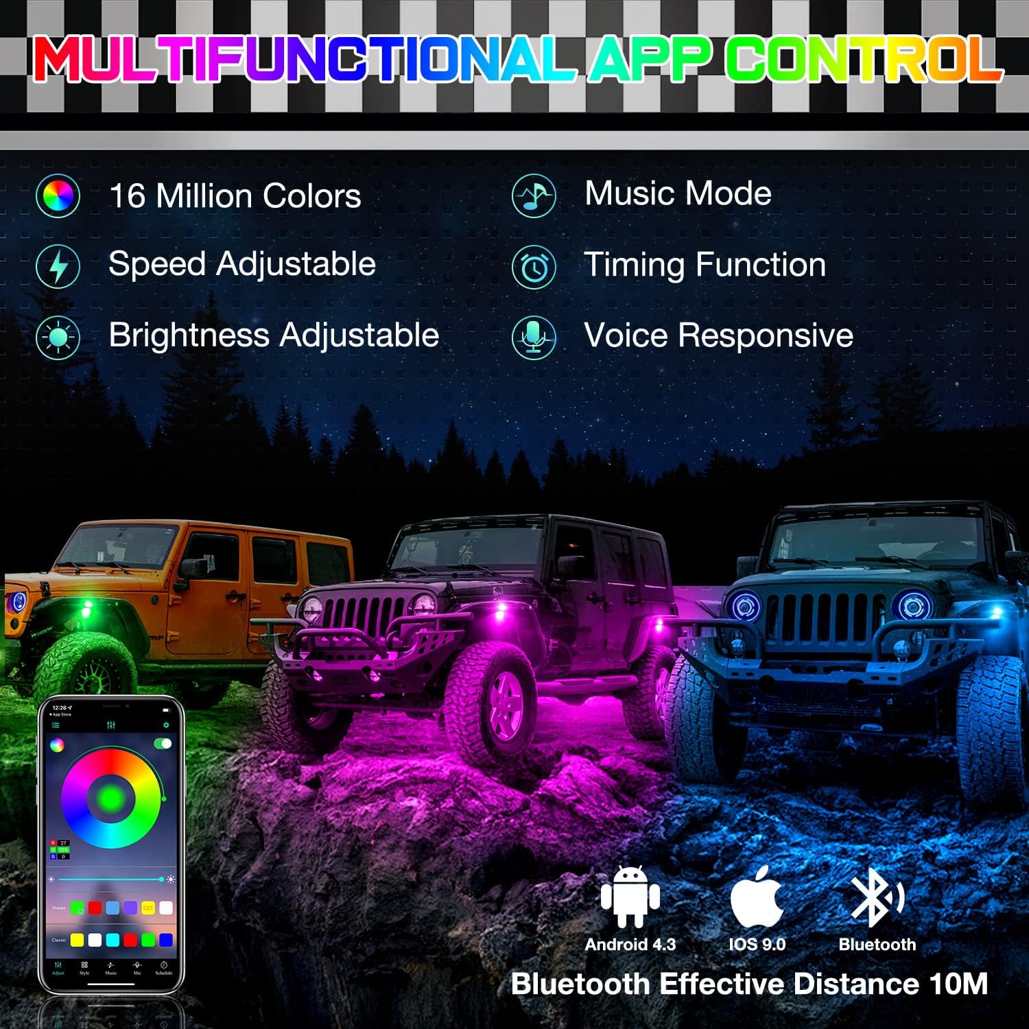 | Additional Features | 12PCS Rock Lights, IP68 Waterproof, Die-Cast aluminum Housing, 2 Types of Mounting Pads, Bluetooth Controlled & Timing & Music & Voice Responsive Mode |