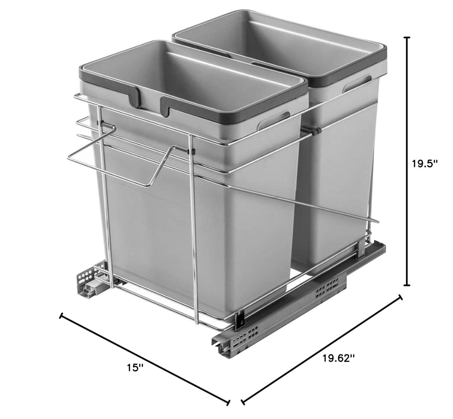 15" Base pull-out waste bins. Soft close, wire bottom, full extension (500mm). Handle and door brackets included. Two 32 Qt. plastic bins. The waste bins are equipped with handles to easily keep your trash bag inside and lift cans up. Bottom mount. Depth: 19-5/8" Width: 15" Height: 19-1/2" Product Features - Bottom mount or side mount. - Full extension (500 mm). - Soft close. - Easy installation with only 4 screws. - Door mount brackets and clip on handle included in the kit. Waste Bins - Recyclable, non toxic material. - Resistant to low & high temperatures. - Non deformable. - Integrated handles for easy removal. Door-mount Bracket 3 way adjustability for alignment of the cabinet door: height (+/-2mm), Side (+/-3mm) and depth (+/-4mm), easy installation with only two screws; suitable for standard style doors and five piece doors as well.