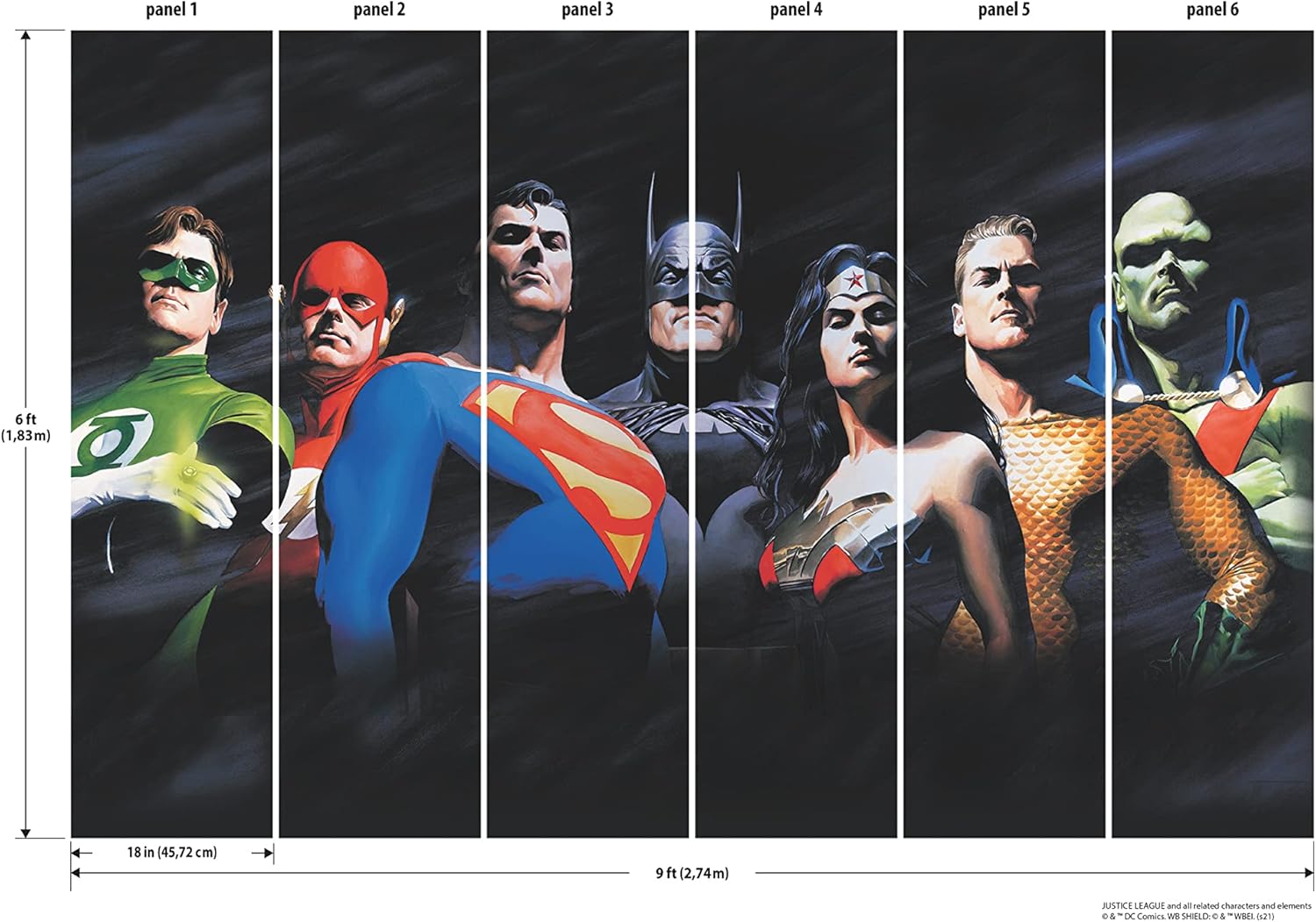 The DC Universe stands behind you in this Alex Ross Justice League Peel and Stick Mural. The show-stopping signature style of artist Alex Ross creates gigantic and dramatic art for the wall, capturing iconic superheroes Flash, Green Lantern, Superman, Batman, Wonder Woman, Aquaman, and Martian Manhunter in this modern removable and repositionable peel and stick mural. It is easy to apply in dorms, bedrooms, playrooms, study, and gaming spaces. RoomMates Peel and Stick murals are high-quality and ultra-removable, creating fun, renter-friendly décor with ease of application and no residue or damage to walls, ever.
