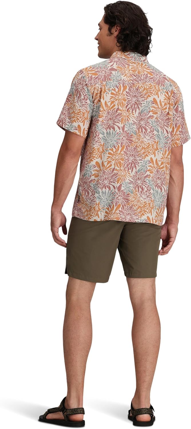 Ace the semiformal look with the Royal Robbins Comino Leaf Short Sleeve shirt. Roomy relaxed fit improves comfort, freedom, and airflow. Soft, cool, quick-drying, and eco-conscious lightweight TENCEL modal blend fabric. UPF 50+ sun protection. Classic spread collar and short sleeves. Allover unique print featuring leaves. Center-front button closure. Natural coconut buttons for an enhanced look. Drop-in chest pocket with sunglass sleeve. Back pleats for extended range of motion. Straight hemline. 75% modal, 25% polyester. Machine wash, tumble dry. Imported.