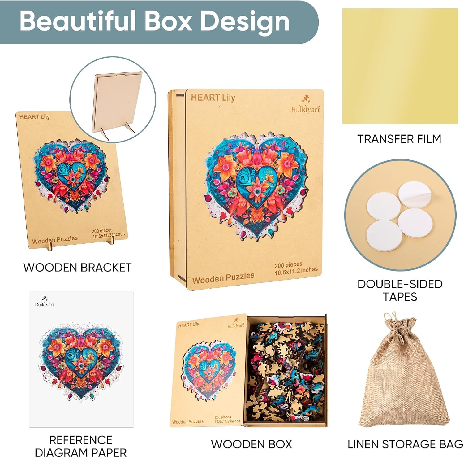 | Included Components | Linen Storage Bag, Puzzle Pieces with Unique Shapes, Reference Diagram Paper, Transfer film; Double-sided Tapes, Wooden Box |