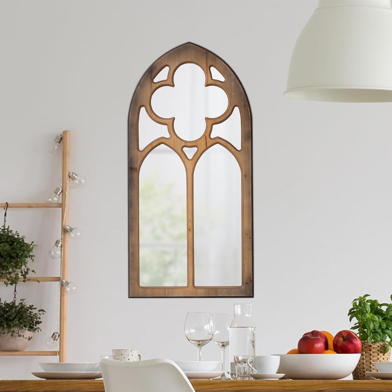 • [GOTHIC DECORATIVE MIRROR] This arched decorative window mirror is designed with four-leaf grass pattern, and cathedral architectural elements, will add Gothic ambiance to your bedroom, bathroom, living room or any space, mysterious and natural.