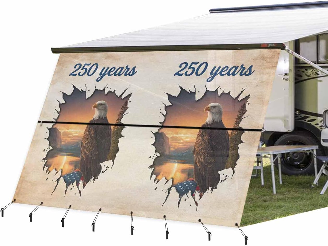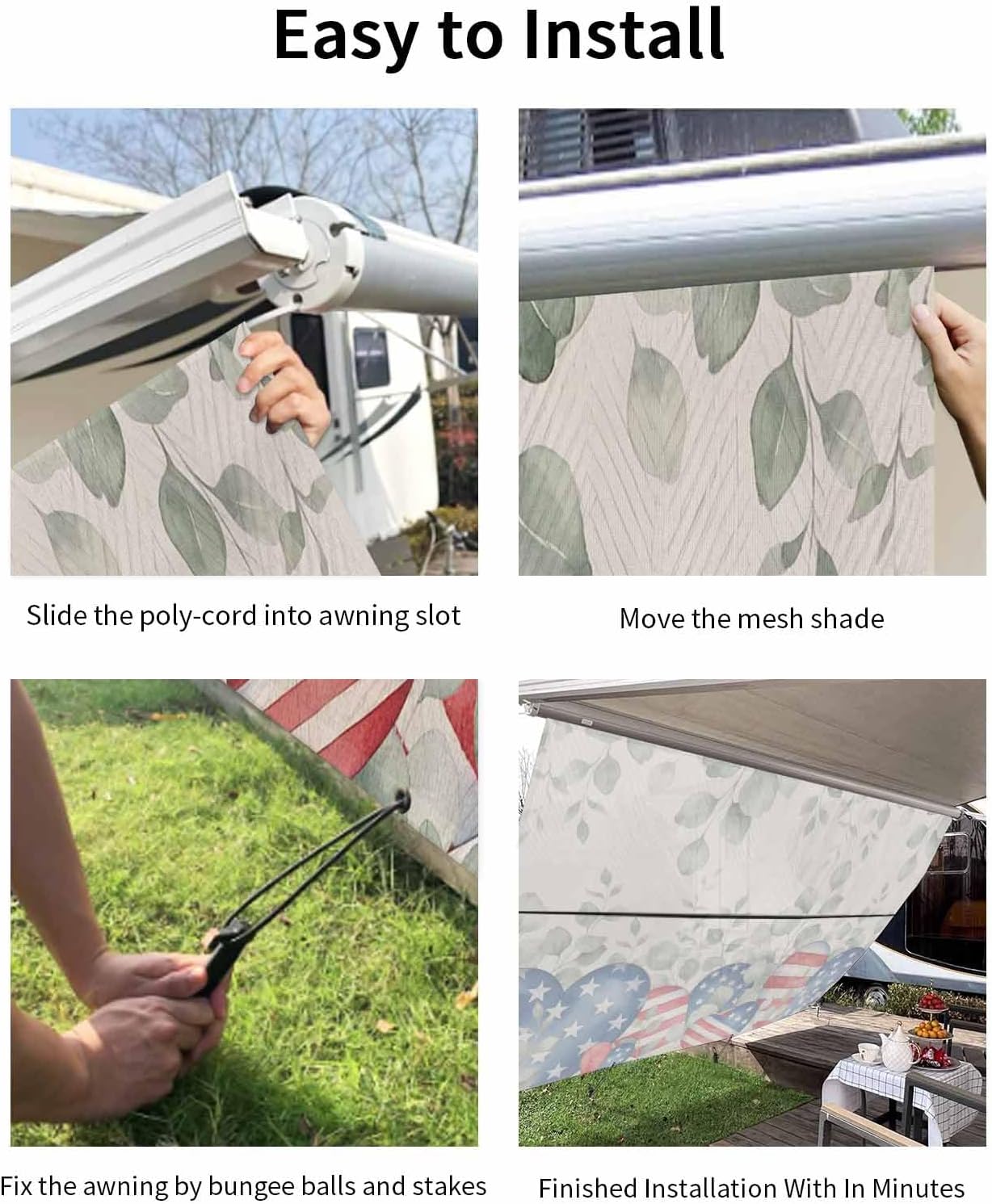 Premium High-Density Polyester Mesh RV Awning Sun Shade Screen, An Essential Addition for Camping Trips.How to Choose Your Perfect Fitted Size Method A: Please measure your existing awning from center of arm to center of arm. This 9'x7' shade has a finished fabric measurement of 9' drop by 7' length and fit for 7' RV awning.Method B: Measure your outdoor awning fabric length and choose same length of our RV shade. For example you measure your awning fabric as 7', please simply choose this 9'x7' shade.Why Choose Our RV Awning Side Shade1. These RV sun shade screen help block out those crazy sun rays that try to beat you down while camping and also give you privacy when camping right next to others.2. RV awning shade screen can be easily fixed by sliding into the RV awning rail with coming poly-cord. You just leave the upper section on to roll in and out with the patio awning and zip on the lower section when needed.3. Bungees fastest fix compared to normal rope tie down. When the winds whip up and storms come in, you just unzip it and roll in the awning and stow the bottom section with the bungees, it's that easy.4. High-density material mesh has better durability and will retain its color after long-term use.The bottom of the RV awning screen is equipped with 4 thick grommets that no crack by strong pulling and can be used normally in extreme weather.5. The RV awning side shade screen helps avoid your RV awning from being blown down and damaged by the wind.6. This mesh awning sun screen is designed to fit a wide range of popular awning systems, ensuring versatility and ease of use.We provide a variety of color options: Black, White, Blue, Green, Orange, Grey...Package Include4 x Plastic Stakes4 x Bungee Cords1 x Awning Shade Screen 9' x 7' (9 Feet Drop, 7 Feet Length)