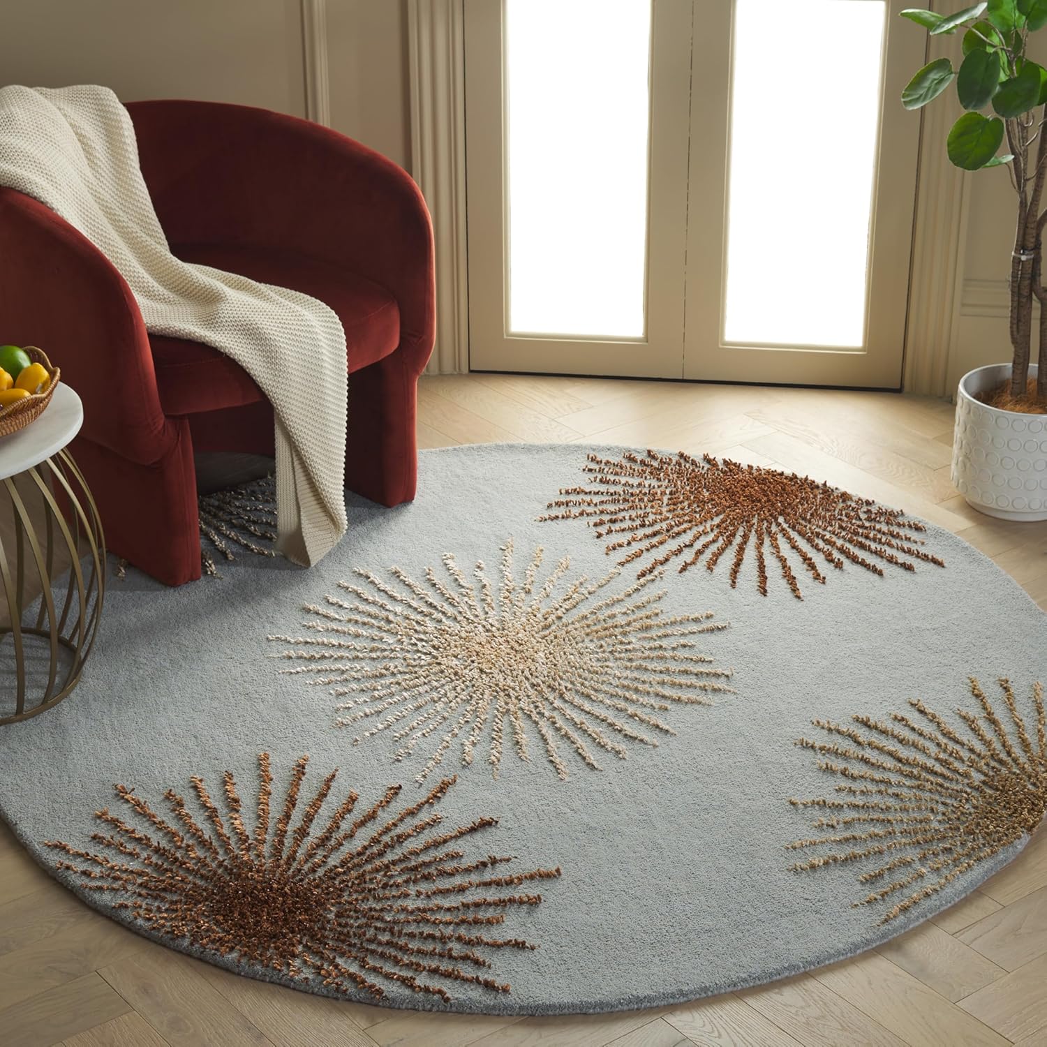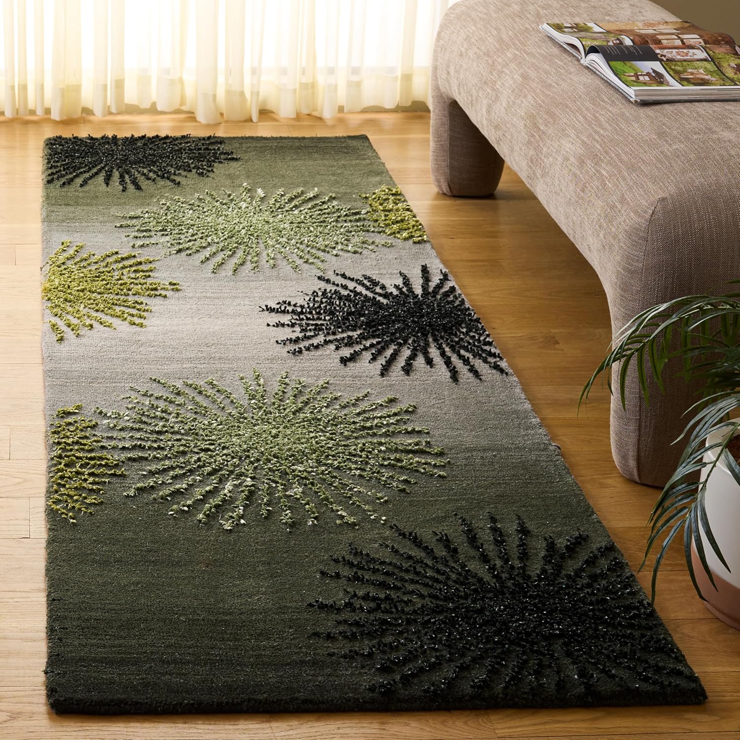 A visual and textural delight, this lively handmade Safavieh rug brings warmth and creativity to any room it is situated in. The Soho Collection offers a clean, transitional design that works equally well in traditional and contemporary homes. The collection’s unique purity and clarity of the color is achieved by selecting only the purest premium New Zealand wool as a canvas for Safavieh’s exciting new color palette. Vibrant, bold, and sophisticated, this piece is a showstopper with raised celebratory starbursts.An earthy blend of forest, olive green, and grey comprise the background, while the bursts have accents of yellow-green and cream that easily complement most existing décor. Woolen construction provides a soft texture suitable for walking on with bare feet. This design is accented with viscose for silky softness to outline patterns, and to further highlight the suppleness of the wool. Brighten up any room or hallway with this unparalleled Safavieh rug that is sure to make a fresh and bold statement. Country of Origin: India Primary Material: Wool Style: Contemporary Primary Color: Green Rug Dimensions: 5' x 8'