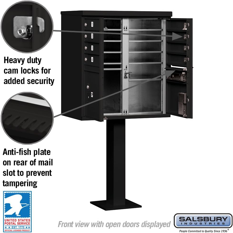 Product Description Constructed of heavy duty aluminum and stainless steel hardware, Salsbury 3300 Series Cluster Box Units (CBU's) are ideal for commercial and residential developments, multi-family homes and many other applications. These units feature a durable powder coated finish available in sandstone, bronze, green, black, white and gray. Salsbury 3300 Series Cluster Box Units are manufactured to U.S.P.S. "F" specifications and are an officially licensed product of the U.S. Postal Service for centralized mail delivery. The 3300 Series Type I mailboxes are accessed through the front through two (2) easy opening master door panels and includes an "Outgoing Mail" compartment, two (2) fully integrated parcel lockers and the U.S.P.S master lock access door (lock installed by the U.S.P.S). Salsbury Industries is an ISO certified company and has excelled in the field of manufacturing since 1936. From the Manufacturer Salsbury 3300 Series Cluster Box Units (CBU's) - U.S.P.S. Access. Salsbury Industries is officially licensed and authorized by the U.S. Postal Service to manufacture Cluster Box Units (CBU's). Manufactured by Salsbury Industries to U.S.P.S. "F" Specifications. License # 1CDSEQ-08-B-0026. Ideal for commercial and residential developments. Include matching pedestal. Constructed of heavy duty aluminum and stainless steel hardware. Feature a durable powder coated finish available in sandstone, bronze, green, black, white and gray (for replacement units only). Accessed from the front through 2 easy opening master door panels. Available in "A" size doors (12-3/4" W x 3-1/8" H) and larger "B" size doors (12-3/4" W x 4-7/8" H). Doors include a heavy duty 5 pin cylinder cam lock with a dust/rain shield and 3 keys. Salsbury Industries is an ISO 9001: 2008 certified company and has excelled in the field of manufacturing since 1936.