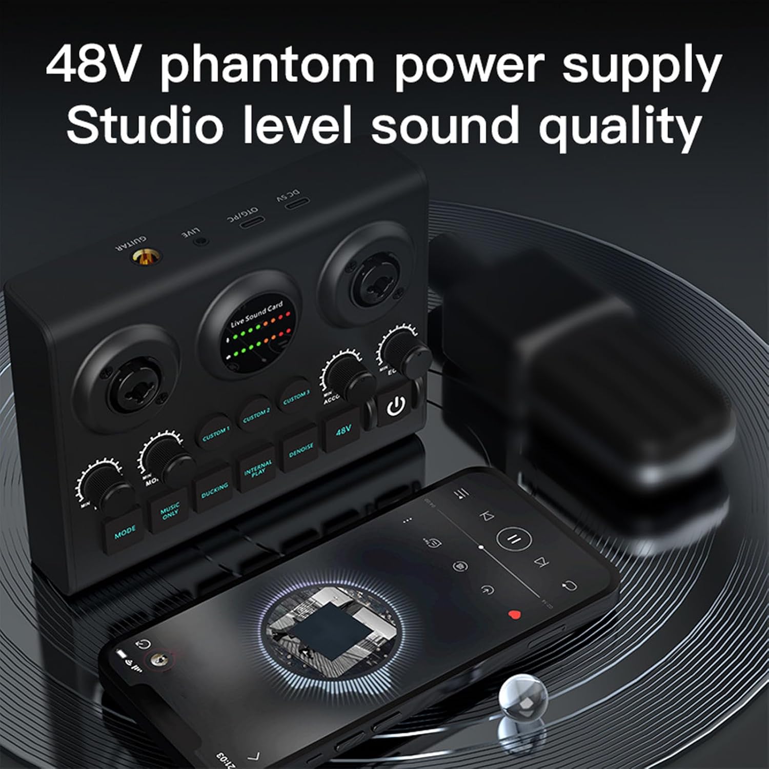 Spec: Function Keys: 7 keys Custom Sound Effects Button: 3 keys Analog Audio Output: LT/RT, stereo Dynamic Range 1kHz: ≥ 105dB Crosstalk: ≥- 106dB Signal to Noise Ratio: ≥ 85dB Output Level (Vrms): Vrms (1.0~2.0V 10kR) Earphone Output Power: 5 mW x2CH Frequency Response: 5MHz (Output Sampling Rate: 44.1KHz Sampling Bit: 16 bits Charging Interface: Type-C Charging Power Supply: DC 5V-1A Charging Time: (power off) Approx. 3 hours Usage Time: Approx. 8 hours Battery Type: Rechargeable lithium battery (built-in) Battery Capacity: 3.7V/1800mAh Product Color: Black Product Size: Approx. 15 * 11.5 * 4.7 cm/5.9 * 4.5 * 1.9 inch Product Weight: Approx. 382 g/13.5 oz Package List: 1 * Sound Card 1 * USB-C Charging Cable 1 * Audio Cable 1 * OTG Cable 1 * Instructions