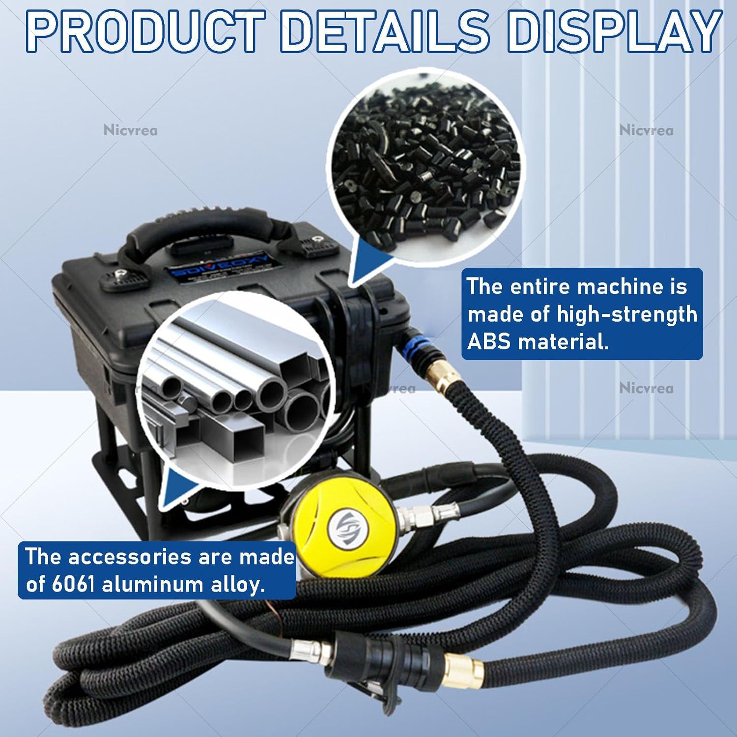◕Portable Diving System – The ultimate solution for your underwater adventures!Upgraded Scuba Diving System featuring a removable battery for easy swaps and extended dives of up to 60-70 minutes, it ensures you stay underwater longer. With an enhanced air intake and a reinforced hose, enjoy smoother breathing even in rough conditions. Dive deeper and breathe easier—upgrade your dive gear today!Perfect for a variety of uses – Recreational diving, underwater photography, fishing, scientific research, and underwater maintenance. The system adapts to your diving needs, providing reliable air supply in diverse underwater scenarios◕SpecificationProduct name: Diving VentilatorMaterial: ABS, Aluminium AlloyColors: Blue, RedMotel: Single-Battery, Dual-BatteryUse depth: 9mBattery capacity: 12600mah/151whBattery operating time: 60~70minProduct Size: 27*21*23cm /10.6*8.3*9.1inchRated power: 180WAir supply: 52 liters/minVoltage: 11.1 Volts◕1*Battery Packing ListDiving Ventilator *1Charger *1Backpack *1Diving Harness *1◕2*Battery Packing ListDiving Ventilator *1Charger *1Backpack *1Diving Harness *1Spare Air Tube *1Spare Battery *1Spare Airbags Liner *1◕Notice1.The device can only be used in water. Do not use in places with strong waves.2.After using in seawater, rinse the device with fresh water immediately to prevent corrosion of the device.3.Before using in water, please make sure the charging cover is tightly closed.4.Non-professional divers should dive under the guidance of professional divers.