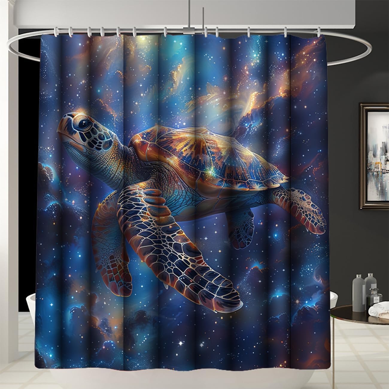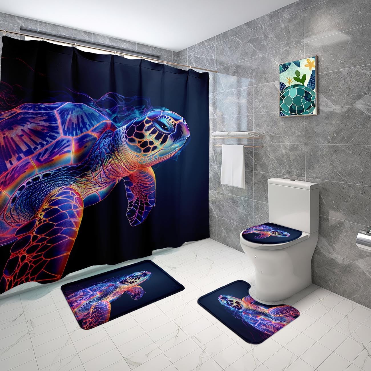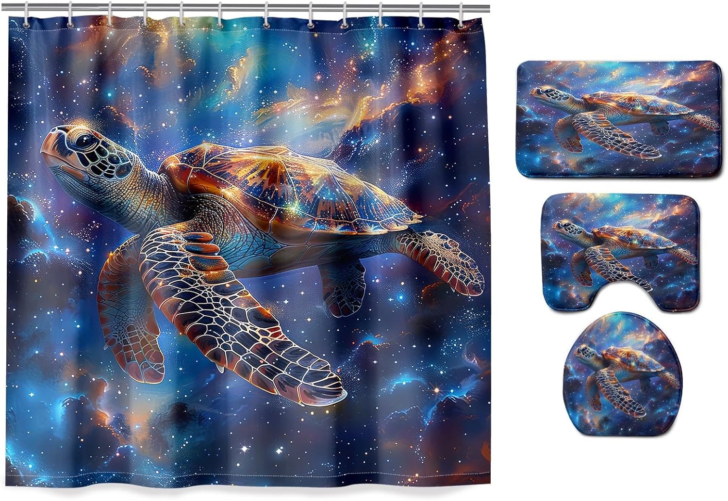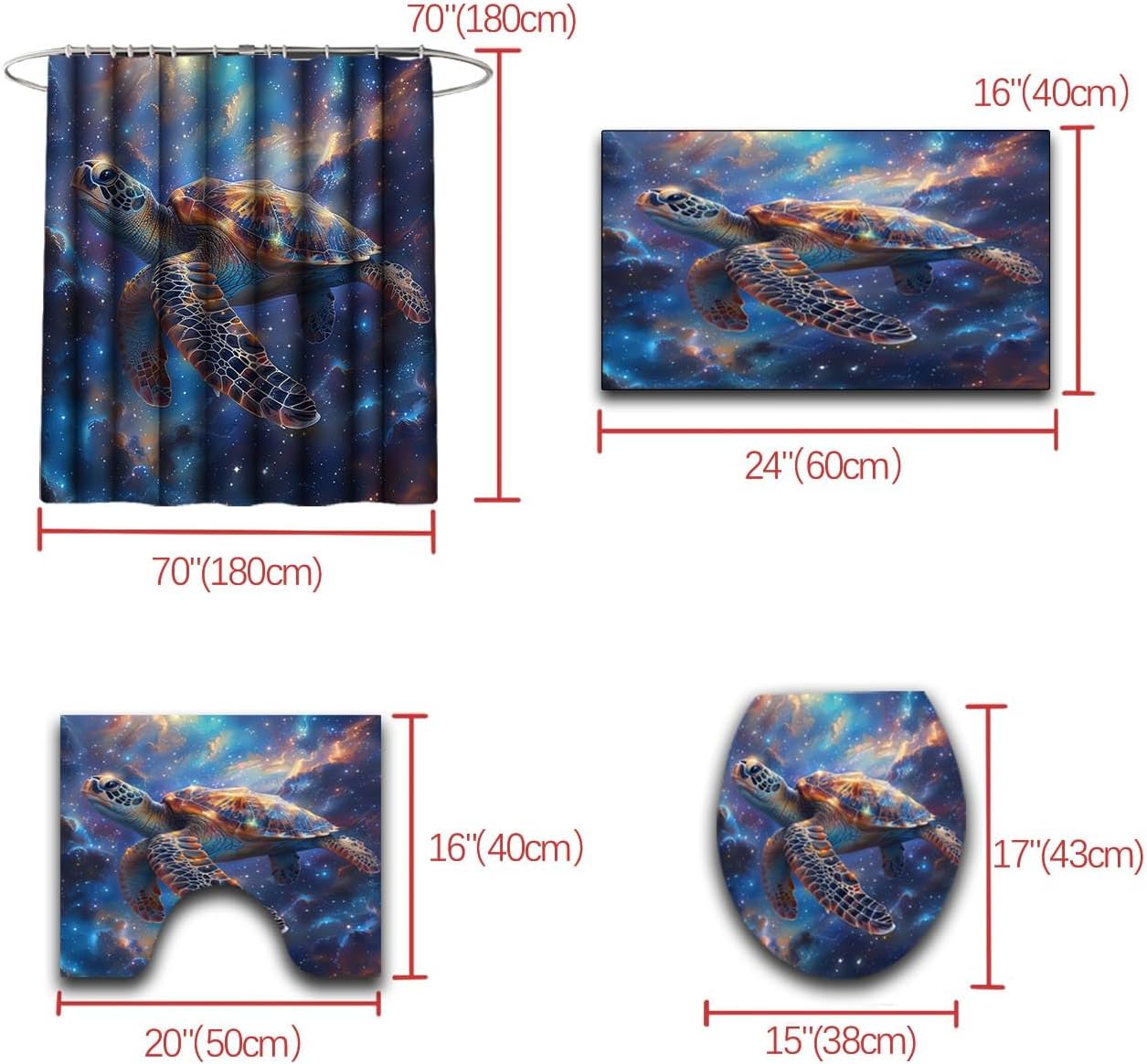 This 70 x 70 inch sea turtle theme is perfect for kids who want to upgrade their bathroom decorThis Sea turtle shower curtain is made of eco-friendly polyester fabric, can machine washable and colorfast. The vivid print design features a unique ocean world that will instantly transform your bathroom into a world of the ocean.This easy-to-install shower curtain requires no padding and comes with metal ring holes and hooks for easy use. The set also includes 12 hooks to fit a variety of bathroom Spacessea turtle shower curtain size:Shower curtain size: 70" X 70"Bathroom mat size: 24" X 16"O-shaped toilet cover: 17" X 15"U-carpet: 20" X 16"Help you install the shower curtain easily. (12 Hooks)