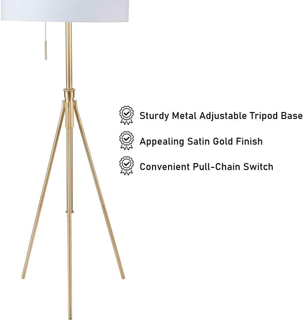 "TRIPOD FLOOR LAMP WITH ADJUSTABLE HEIGHT - A MODERN LAMP THAT LOOKS GREAT WITH ANY DÉCOR – This minimalist floor lamp looks gorgeous and three leg tripod design provide good support and stabilization, provide warm light over a chair or in a dark corner and create warm ambiance to your room. A drum shade and satin gold finish add classic touches.Transitional style and size of this lamp fits well into residential or commercial settings, great for bedside table, office desk, or living room while providing pleasing light. "