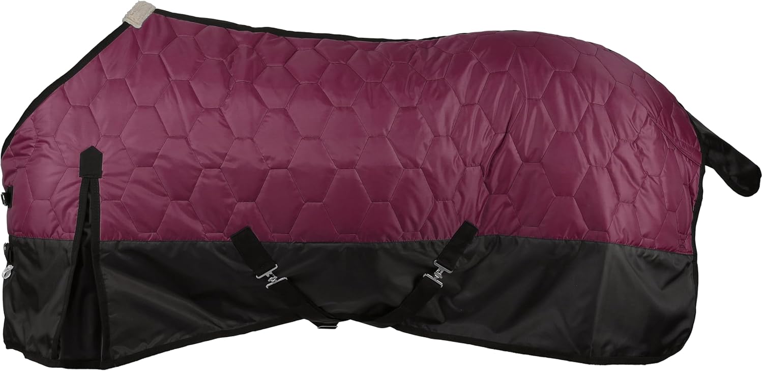 Showman 420 Denier Quilted Nylon Horse Blanket. With its sleek and durable 420 Denier nylon outer shell, this blanket offers a great combination of protection and comfort. The quilted design not only looks great but also adds an extra layer of warmth, making sure your horse stays snug and content even when the temperatures drop.Inside, the 70 Denier rip-stop lining ensures that this blanket can stand up to daily wear and tear. Whether your horse is rolling around or just enjoying some downtime, this lining provides added durability to keep the blanket in top shape. The 300-gram polyester filler acts like a cozy insulation layer, trapping warmth without making your horse feel too bulky or restricted.Comfort is key with the blanket. The fleece withers protection prevents rubbing, ensuring your horse stays comfortable all day long. The shoulder gussets and tail cover add to the blanket’s thoughtful design, allowing for a full range of movement without sacrificing coverage. Your horse can move freely, enjoying the perfect fit that keeps them warm and protected.Fastening the blanket is a breeze with the standard open front and double buckle closure. It’s easy to put on and take off, while the two surcingle belly straps and leg straps ensure it stays securely in place, no matter how active your horse gets. This blanket is a functional piece, perfect for keeping them warm during those cooler days in the stable. Available Sizes: 62" to 82" - Available Colors: Black, Burgundy, Red, Blue & Teal.