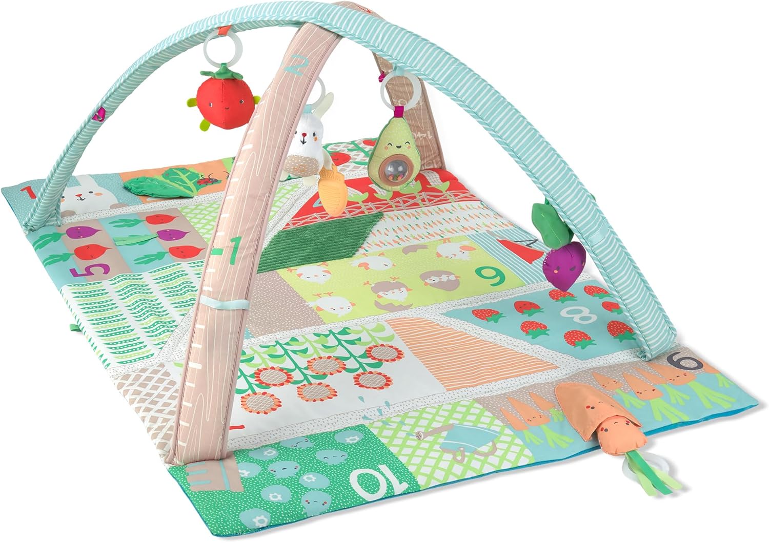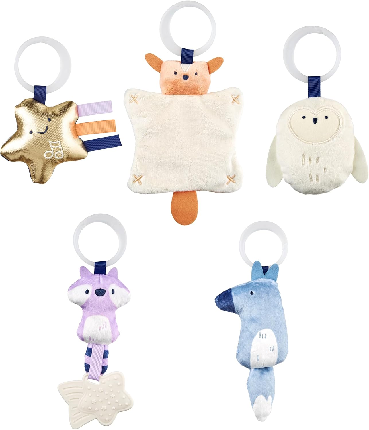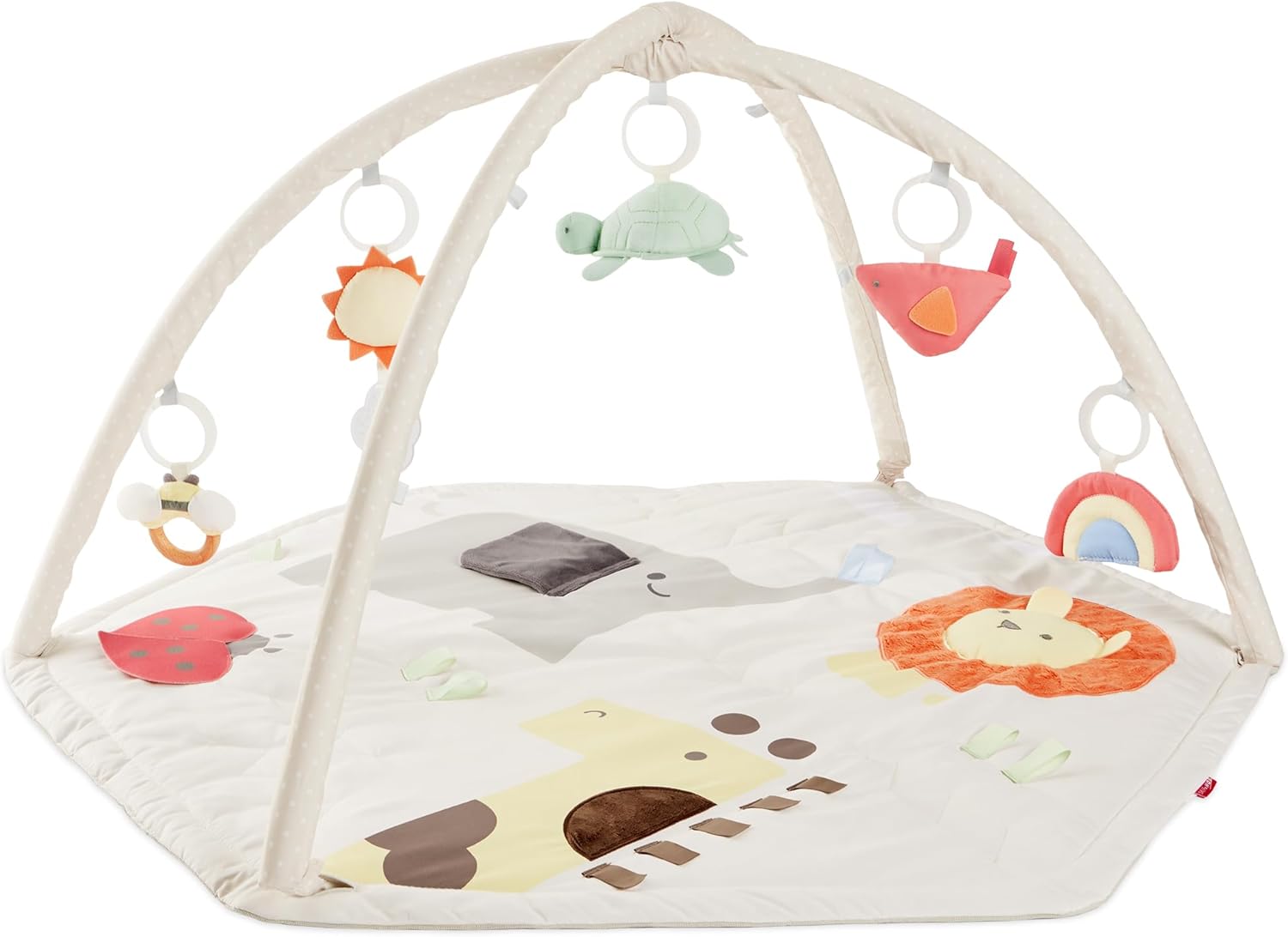Packed with a galaxy of fun for baby, our dreamy baby activity gym features a celestial-themed baby play mat with plush quilting details. A crescent moon mirror for tummy time play encourages strength and coordination plus self-recognition. Five nocturnal animal hanging toys engage your little one’s senses with music, sounds, textures and more to explore.