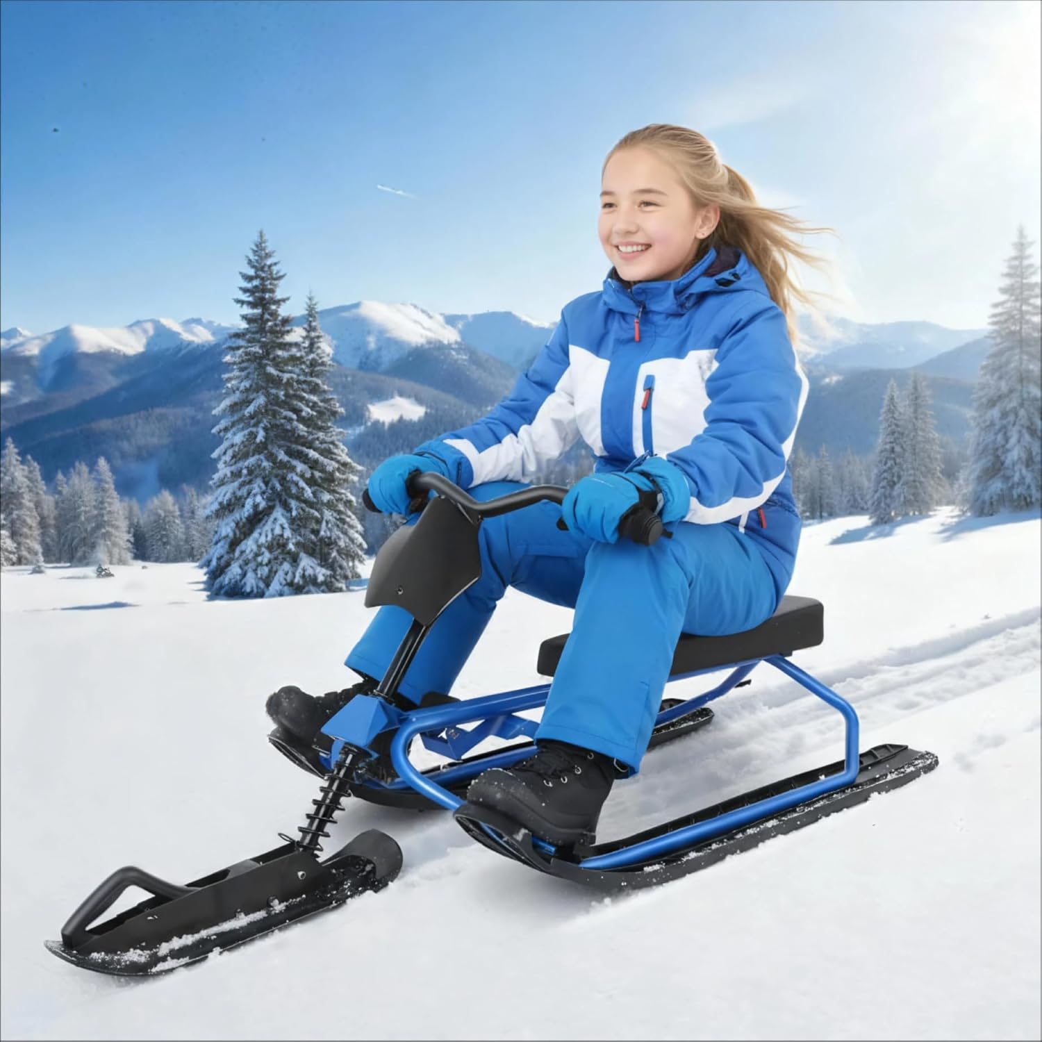 Wodesid Snow Racer Sled – Elevate Your Winter Adventure Experience the ultimate thrill of winter with the Wodesid Snow Racer Sled! This innovative snow scooter combines bike-like handling and rugged sled performance to deliver unforgettable moments for 13+ and adults. Designed for speed and control, our snow sleds excel on snow-covered hills while maintaining excellent stability. Advanced Safety & Effortless Control Navigate with confidence using the professional steering system and sensitive dual foot brakes. These utility sled components work together to deliver a secure ride across varied terrain. All-Terrain Versatility & Comfort Built for winter excitement, this heavy-duty snow sled features an extra-large cushioned seat that comfortably supports two riders—ideal for family adventures. Long-Lasting Build for Long-Lasting Fun Crafted to stay flexible and strong even in extreme conditions, this sled for snow features reinforced welding and impact-resistant construction for reliable performance season after season. Whether used for high-speed runs on snowy mountains or as an ice fishing sled, it stands up to tough use while performing at its best. The Perfect Choice for Outdoor Family Fun Suitable for 13+ with a 330 lb weight capacity, this snow sled for adults brings friends and family together for quality time outdoors. Its intuitive design ensures that everyone—from first-time riders to experienced winter sports fans—can enjoy thrilling, easy fun. Features:Ski sled snowboard cool car steering control with brake sledge suitable for whole family to use.The underside texture guides the airflow, making the snow racer more stable to take off.Convenient to use when going uphill or difficult to advance. Adjustable up and down to adapt to uphill and downhill.Steering wheel gives complete control over the sled and adjustable left and right to change direction at any time.This snow racer features a stable, rugged steel construction with durable skis for adults.It will provide you with countless hours of winter fun and provide you with more in the years to come.Specification:Material: Polyethylene (PE) + Alloy SteelColor: Blue+BlackSize: 47.2*19.6*17.7inchPackage Size: 33.46*16.93*8.66inchWeight: 17.6 lbPackage Included:1 x Snow Racer
