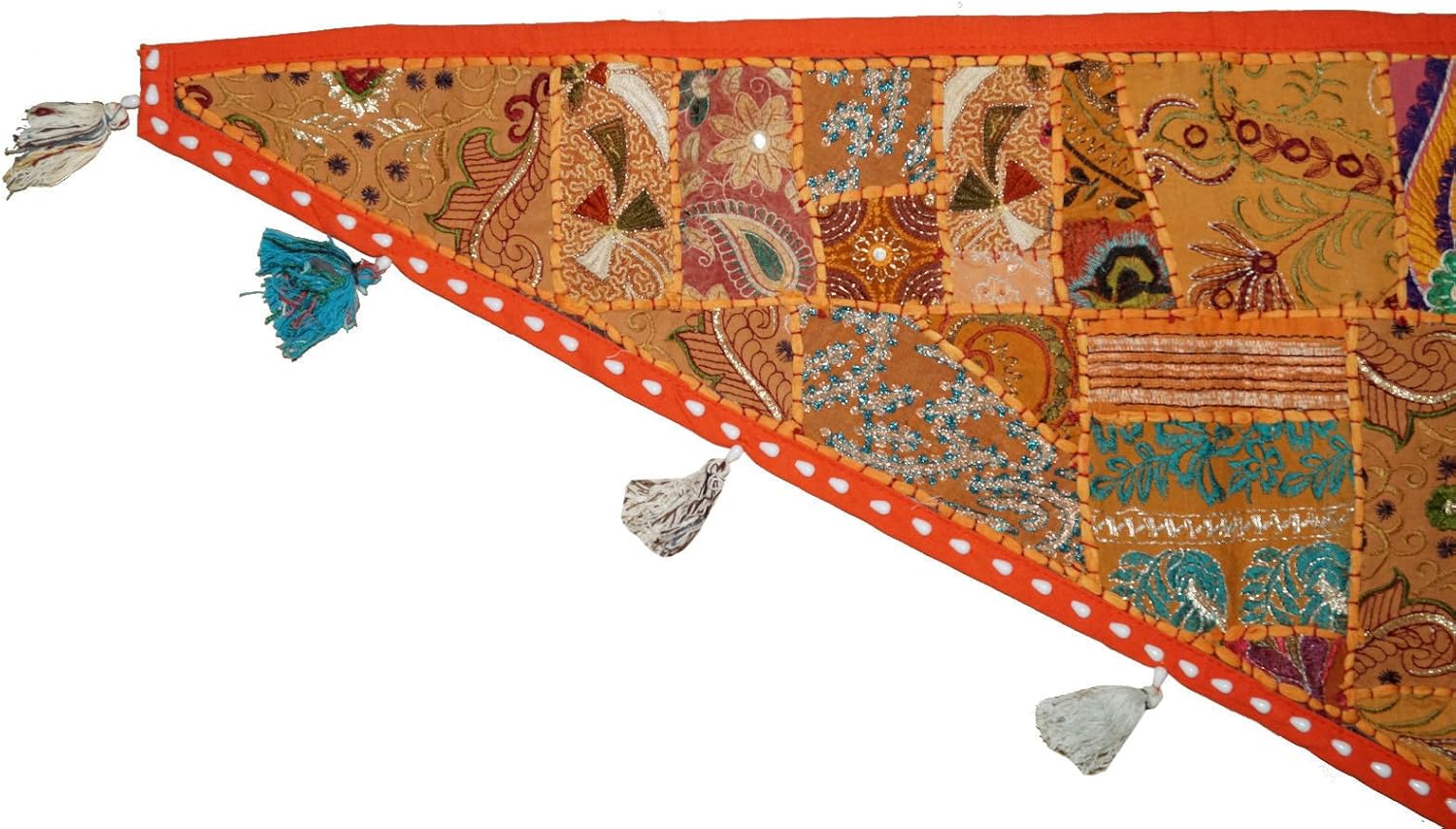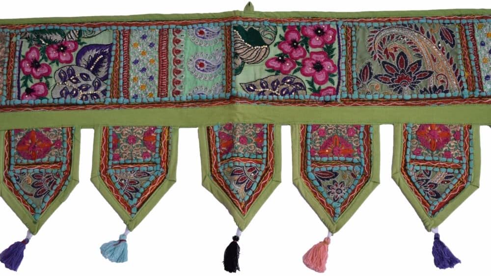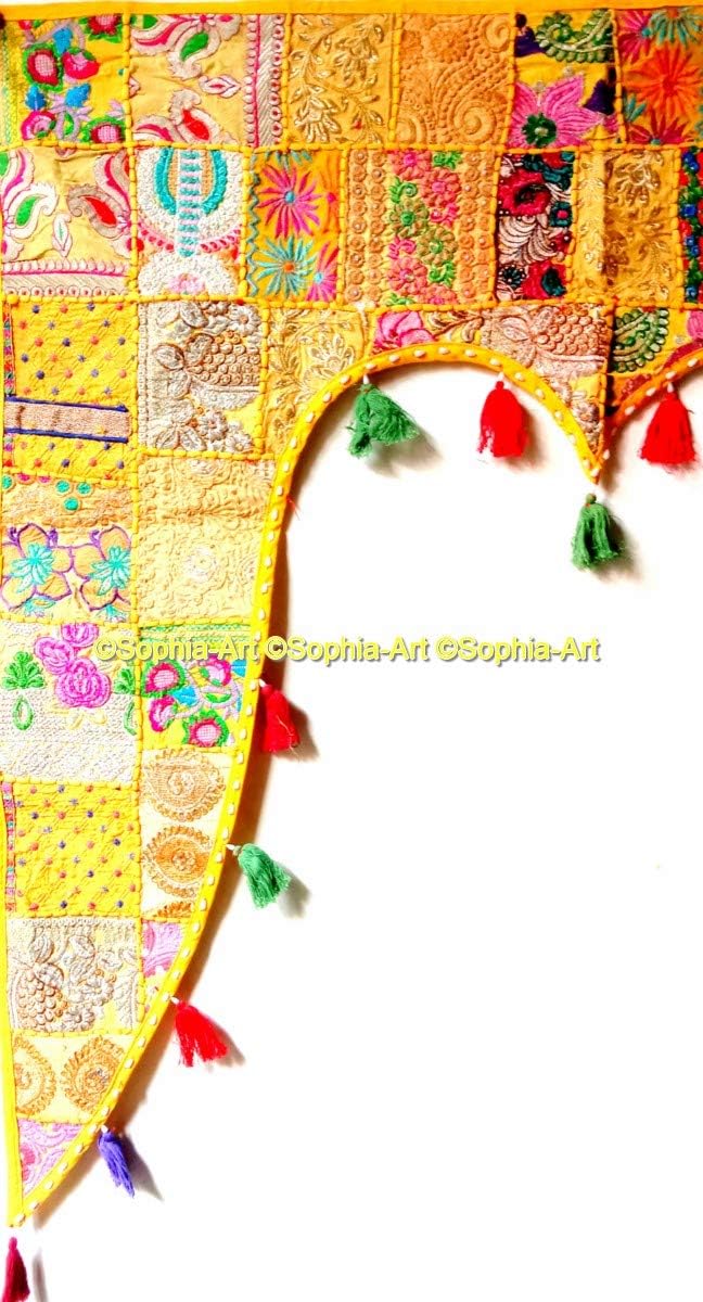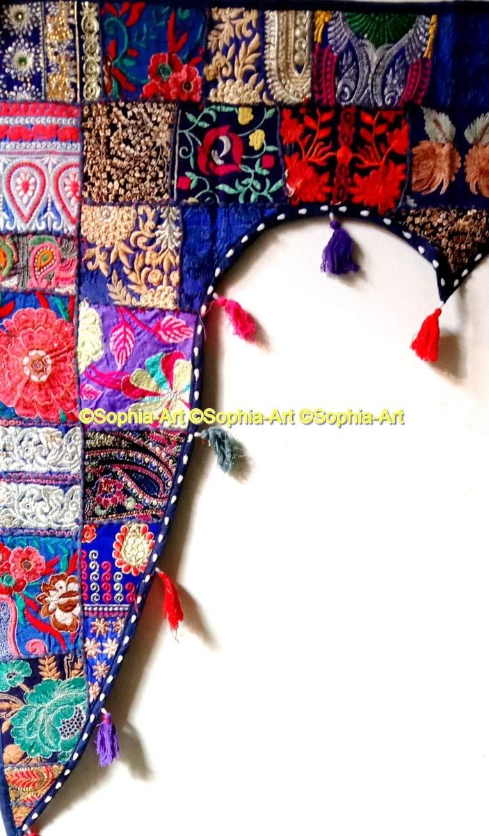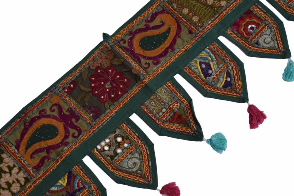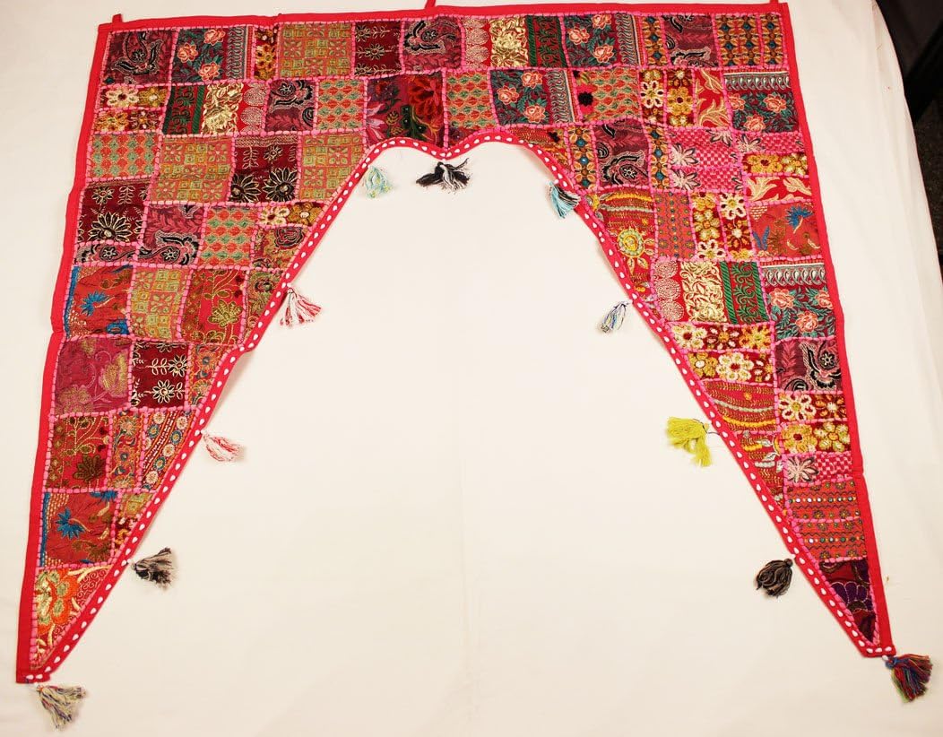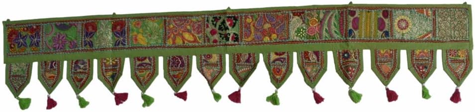 A Beautiful Home Decorative Indian Patchwork Embroidered Window Valence Door Hanging Bandhanwar Toran. You are looking at a very vibrant & stunning work of Ethnic Folk Craftsmanship. The Beautiful Mirror work with Traditional Rajasthan. Patchwork is one of the most prized styles of hand embroidery. What distinguishes this memorable style of embroidery is the fact that it covers every inch of fabric with exuberant colors of rural western India.This lovely picturesque hand crafted & 100% hand embroidered Toran / Valence is a visual delight. The extensive mirror work adds to the sparkle and lends a spectacularly ethnic look and add style to your room. Transform your window / door / wall with the royal grandeur of Indian culture. This hand embroidered Toran will be sent to you directly from India & is guaranteed to bring you lots of compliments and is truly a bohemian crazy, conversational piece of accessory that everyone's room needs.Hardly ever seen in any departmental store, this is a fabulous & unique gift for your loved ones! Don't miss this fabulous offer! Size Chart- 78" X 13" Big Valance, 39" X 13" Small Valance, 46" X 42" Gate Valance.