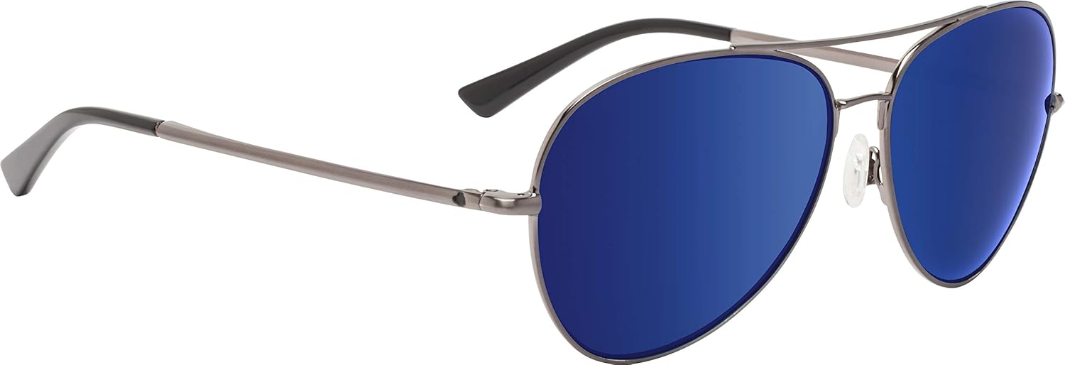 Watch your style take flight with the beyond cool vibes of the Spy Optic® Blackburn aviator sunglasses! Lightweight sunglasses in a slightly oversized silhouette in a revived aviator design. HD+ lens technology enhances color and contrast, improves mood and alertness, and provides distortion-free optics. Polarized colorways block over 99% of surface glare and is layered and sealed within the lenses to prevent scratching, delaminating, and hazing of your polarized filter. Constructed from lightweight monel alloy and handmade acetate. Comfortable, hypoallergenic silicone nose pads provide a secure fit. 6-base polycarbonate ARC® lenses are injected in a unique tapered shape to provide optically correct, distortion-free viewing at all angles and prevent discomfort and eyestrain. Robust 3-barrel hinges. 100% UV protection reduces eye fatigue and long-term sun damage. Imported. Measurements: Eye Size: 60 1⁄2 mm Bridge: 17 1⁄5 mm Temple Size: 142 mm Weight: 1 oz