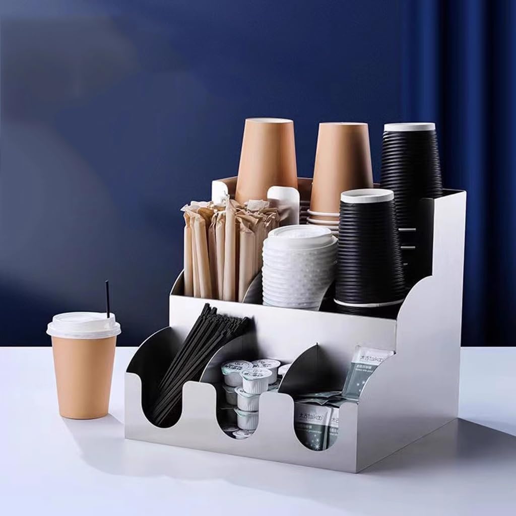 Product Description:Key Features:Tilted Vertical Storage: The angled design securely holds cups and lids with a diameter of up to 10cm (3.9 inches), making retrieval quick and easy.9 Compartments for Total Organization: A tiered, multi-section layout provides dedicated space for paper cups, lids, straws, stirrers, creamer packets, sweeteners, and more—ensuring every item has its place.Durable Stainless Steel Build: Crafted from high-quality stainless steel, this organizer is sturdy, rust-resistant, and built to last. Its sleek, metallic finish adds a modern touch to any setting.Versatile Use: Perfect for homes, offices, waiting rooms, reception areas, cafes, bars, or pantries. It fits seamlessly on kitchen counters, break room shelves, or cabinet tops.Specifications:Product Name: Disposable Cup HolderMaterial: Stainless SteelColor: Stainless Steel (natural metallic finish)Dimensions: 30.5×30.5×29cm (12×12×11.4 inches)Target Users: Ideal for anyone seeking organized beverage stations—homeowners, office managers, cafe owners, and more.Features: Safe (smooth edges), practical, and highly durable.Included in Package: 1× Coffee Cup Holder (other items shown are for display only).Notes:Manual measurements may result in a 1–2cm deviation; please refer to the actual product.Slight color variations may occur due to lighting or monitor settings.