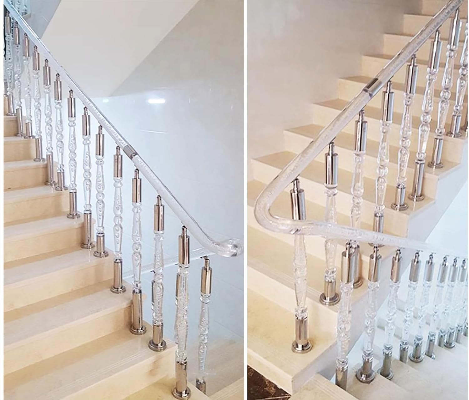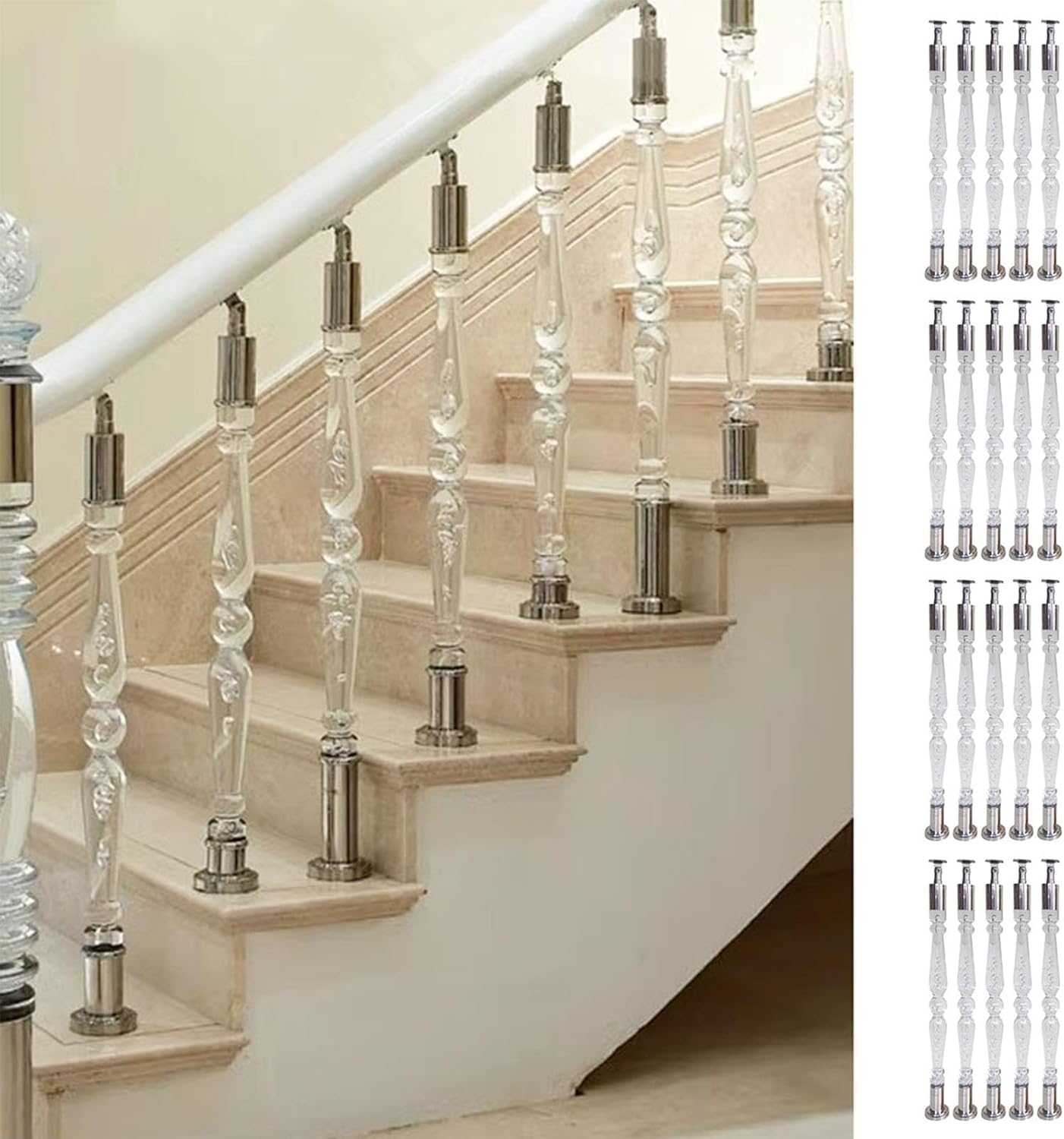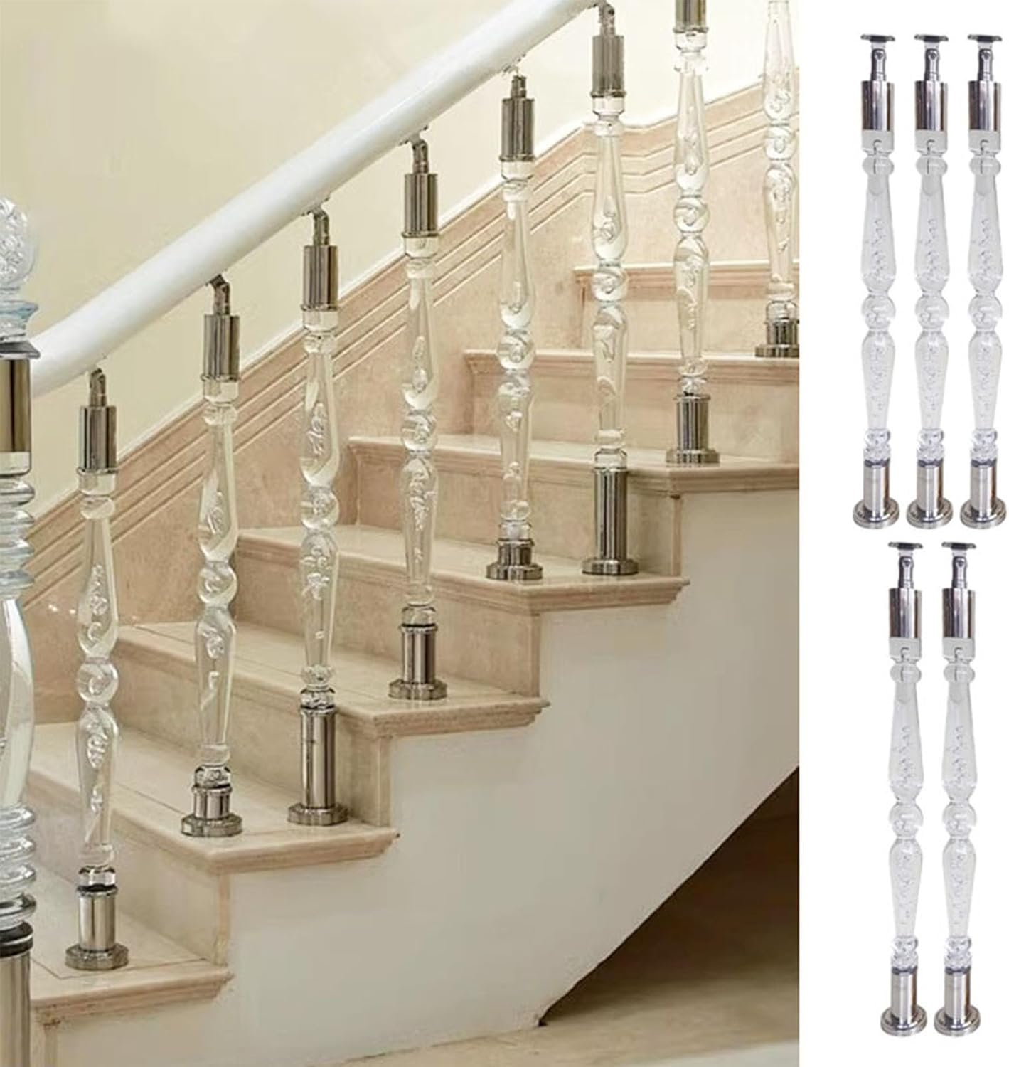 - Stair Baluster- Handrail Bracket- Base Cover- ScrewsSpecifications:- Material: Acrylic and Stainless Steel- Stainless Steel: Bright Finish- Color: Clear and Silver- Base Diameter: 9 cm (3 1/2 in)- Diameter: 6 cm (2 3/8 in)- Height: Customizable- For custom sizes and styles, please contact us via email.Features:- Easy to clean and maintain on a daily basis.- Adjustable armrest bracket for various installation scenarios.- Crystal-clear acrylic with a high gloss finish; resistant to yellowing and damage.- Excellent weather resistance; remains stable in all conditions.- Each railing base comes with 3 pre-drilled holes for simple installation and stability.- Offers a classic, timeless appearance that enhances various stair deck styles.- Provides strong support for the elderly, disabled family members, and emergency response teams.Warm Reminder:- Excludes any horizontal handrails or end posts.- If you cannot find the right size in the available options, please reach out to us for customized service.- Due to differences in monitor settings and lighting, there may be slight color variations between the product images and the actual item.Good Service:- If you have any inquiries about the product, please feel free to contact us anytime. We provide 24-hour customer service.