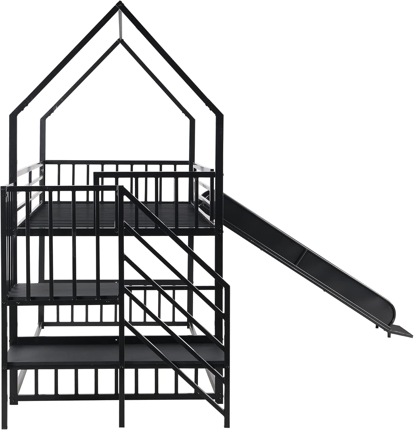 Twin over twin bunk bed with side stairway shelves and slideTransform your child's room into a dream play space with our Sturdy Metal Bunk Bed with Slide and Stairs! This innovative design features a whimsical house-shaped top bunk and an exhilarating slide for endless fun. Built with durable metal, it ensures lasting safety and stability, while the integrated stairway with convenient shelves provides easy access and smart storage. Choose between a Twin-over-Twin Bunk Bed for shared rooms or a Loft Bed configuration to maximize floor space for play or study. Give your kids the ultimate combination of comfort, excitement, and practicality!