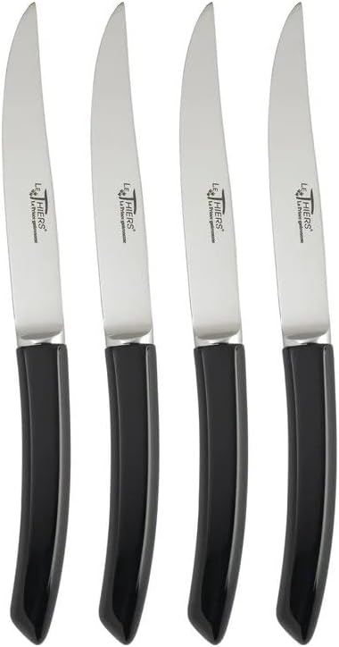 Au Nain's "Le Thiers" Prince Gastronome steak knives are meticulously handcrafted in the bucolic hills of southern France, where each knife is individually handmade by local artisans using time-honored craftsmanship, preserving the tradition of high-quality knife making. These steak knives have luxury opaque Lucite handles in a sophisticated midnight black pearl shade. The razor-sharp stainless-steel blades cut steak with an easy efficiency while the elegant curvature of the knife feels well balanced and is comfortable to hold. Wooden box with 4 “Le Thiers” steak knives. Stainless steel blade with small serration and black handle. Fully forged blade. Gorgeous opaque Lucite handles in a sophisticated midnight black pearl shade Contemporary design brings a sophisticated and elevated ambience to your table Razor-sharp serrated blades slice through steak with ease Elegantly curved handles are well-balanced, substantial, and comfortable to hold and use Dishwasher safe Impeccable quality and construction ideal for professional and home use Made in France