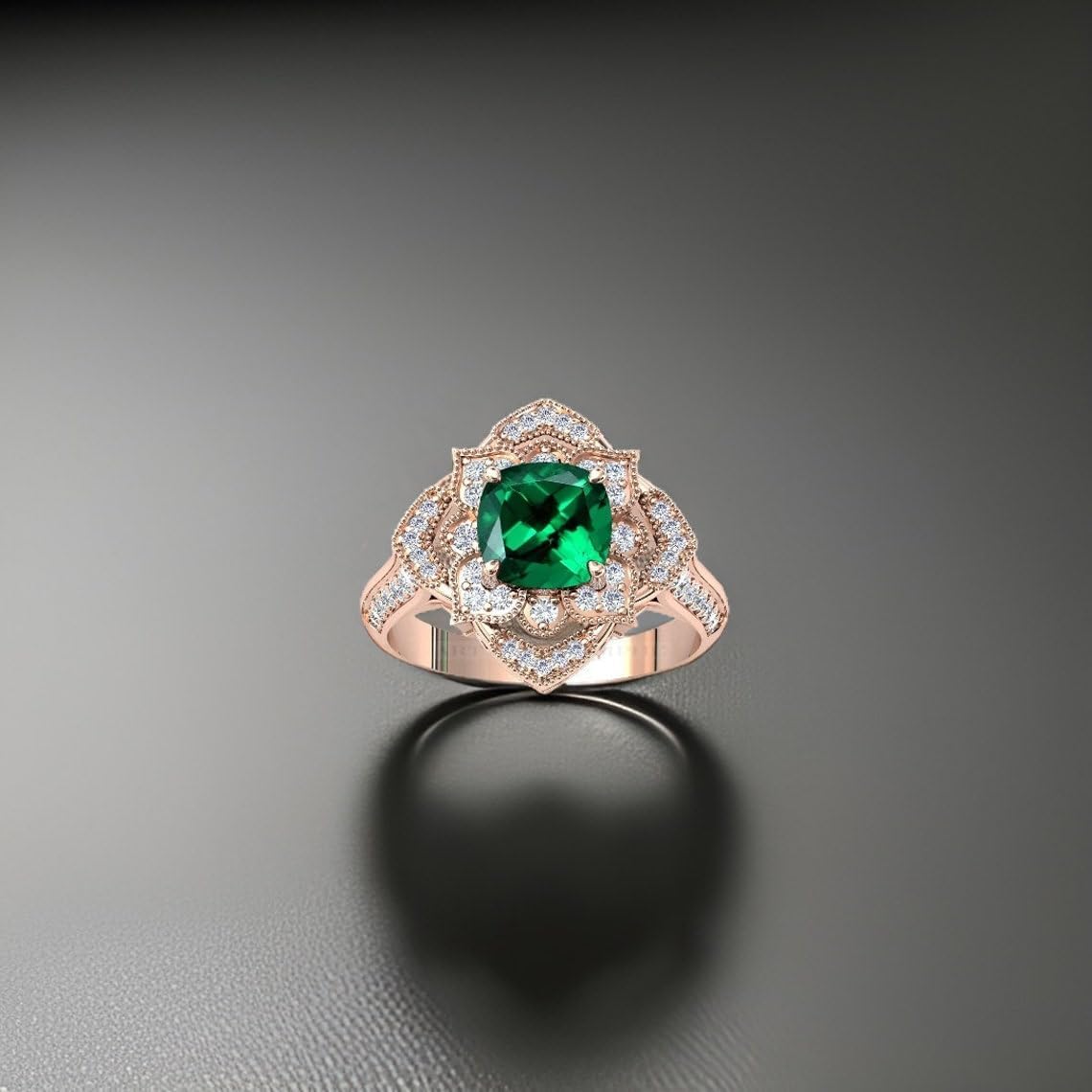 Ring Details: Center Stone: Emerald Shape: Cushion Cut Weight: 2 Ct approx Size: about 7 mm approx Side Accents: High Quality Round Cut Diamonds Weight: about 0.32 Ct approx Ring Weight: about 7 g approx Ring Width: 2 mm approx Ring Thickness: 1.2 mm approx Metal & Purity Setting:- Available in: 925 Sterling Silver All Ring sizes including Half Ring sizes are available from 3-13. Select your ring size and metal/purity setting at checkout. (Please note that the original color and size of the stones used may slightly differ from the image shown.)