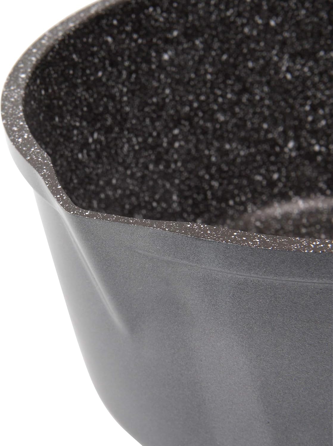 STONELINE - The original! Healthy nonfat cooking and frying This die-cast aluminum saucepan is great for boiling milk or water, for creating delicious sauces, soups as well as for warming up food. The saucepan is equally great for frying and roasting. Nothing burns and nothing sticks even if you prefer cooking without additional fat or oil. The two practical spouts make draining liquids super easy without spilling or having to use additional kitchen utensils!1 sauce pan, &o-slash; approx. 18 cm, height: approx. 9.3 cm, approx. 2.0 l1 glass lid, &o-slash; approx. 18 cm The most important advantages of STONELINE cookware at a glance: Scratch-proof non-stick STONELINE coating Perfect results and crispy meat Perfect taste Vitamin-friendly cooking and frying without fat and oil No burning and no sticking Super easy to clean Suitable for all cookers including induction cookers Extra strong, non-distorting base thickness 4.5 mm This product is oven-proof up to 180 & Material: die-cast aluminum Tips for cleaning and care: We recommend cleaning your cookware thoroughly with water and a mild detergent before the first use. Apply a few drops of cooking oil with a kitchen towel onto the coating. No fat or oil is needed for further use! Thanks to the Easy-Clean effect we recommend cleaning the cookware by hand. Wipe clean with hot water, a mild detergent and a soft sponge.