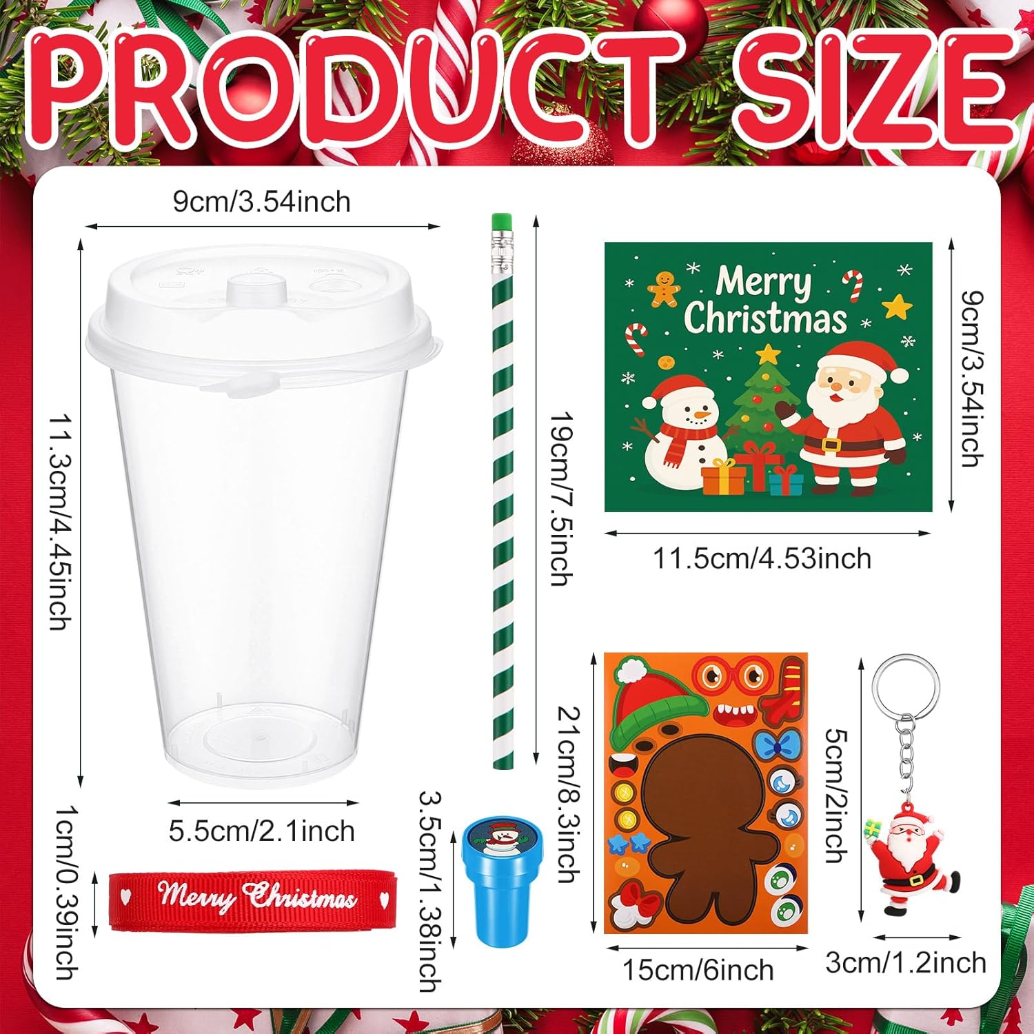 Features: Ideal Christmas Exchanges: This set of Christmas room reward prizes bulk features cute Christmas pattern which is ideal for exchange and sharing, which can help people to express holiday thoughts and interact with mates to build friendships. Perfect Christmas Gifts Stocking Stuffers: This Christmas treat bags fillers is perfect for Christmas party favors, Christmas parties, gatherings, activities. Colorful and cute to attract people into the Christmas, suitable for Christmas, Christmas gift bag fillers, Christmas gifts, rewards and more. Specifications: Material: the Christmas cups and seals are made of plastic, the Christmas keychains are made of silicone, and the other Christmas cards and stickers are made of paper. Color: fashion color Size: the diameter of the cup is approximately 3.54 inches, the Christmas card is 3.54 x 4.33 inches, the size of the cute Christmas keychain is approximately 1.18 x 1.97 inches, and the Christmas sticker is approximately 5.91 x 8.27 inches Package includes: 24 x Christmas cups 24 x Matching cup lids 24 x Christmas greeting cards 24 x Christmas keychains 24 x Christmas pencils 24 x Christmas stickers 24 x Cute stamps 2 Rolls x decorative ribbon Notes: Manual measurement, please allow slight errors on size. The color may exist a slight difference due to different screen displays