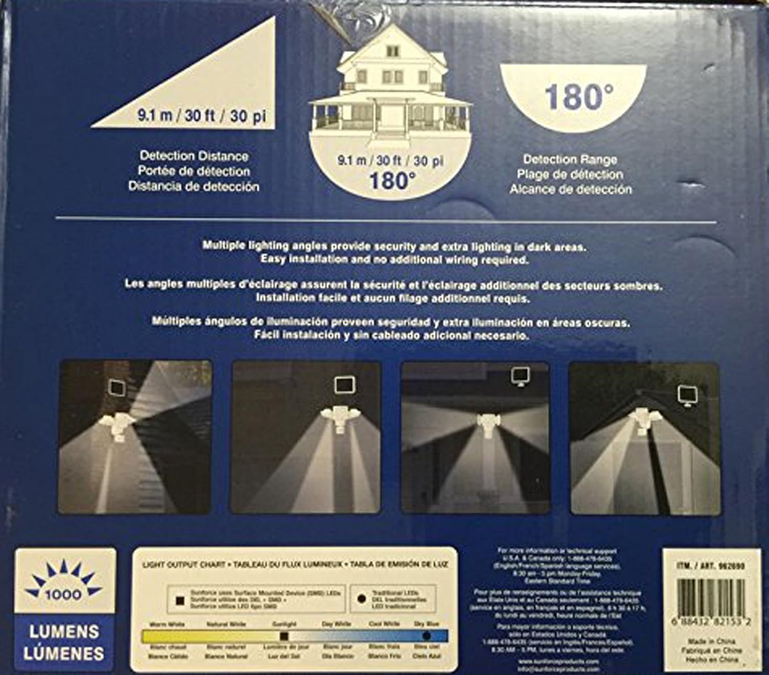 Using the power of the sun, light any dark area and add extra security with the Sunforce 150 LED Triple Head Solar Motion Light. The newly designed light offers adjustable side lamp heads for maximum lighting coverage. This light automatically turns on when motion is detected and comes equipped with 150 super-bright white LEDs, ensuring reliable lighting power for whenever, wherever you need it. Ideal for Item#: 82153 UPC#: 688432821532 Product Dimensions (L x W x H): 12.9" x 6.7" x 9.0"/ 33.0cm x 17.2cm x 23.0cm Product Weight: 2.80 lbs/ 1.27 kg Retail Box Dimensions (L x W x H): 11.4" x 9.1" x 5.9"/ 29.0cm x 23.0cm x 15.0cm Retail Box Weight: 3.50 lbs/ 1.60 kg Download Manual Ideas & How-To’s Share Features Adjustable side lamp heads move upwards, downwards and horizontally for maximum lighting coverage Ideal for all locations: entryways, garages, pathways, sheds, and remote areas Amorphous solar panel charges in all daylight conditions, does not need direct sunlight Charges during the day and works at night 2 adjustable settings: detection distance and light duration Fully weather resistant and can be mounted almost anywhere No main power or wiring required Maintenance-free Includes 150 LED triple head motion light (50 LEDs per lamp head) Solar panel with 15 ft. (4.5m) of wire 3 x AA rechargeable batteries Mounting hardware Technical Information LED Technology: SMD (Surface-Mount-Device) Lumen Output: 1,000 Detection Distance: 30ft. (9.1m) Detection Range: 180 degrees Solar Panel Technology: Amorphous
