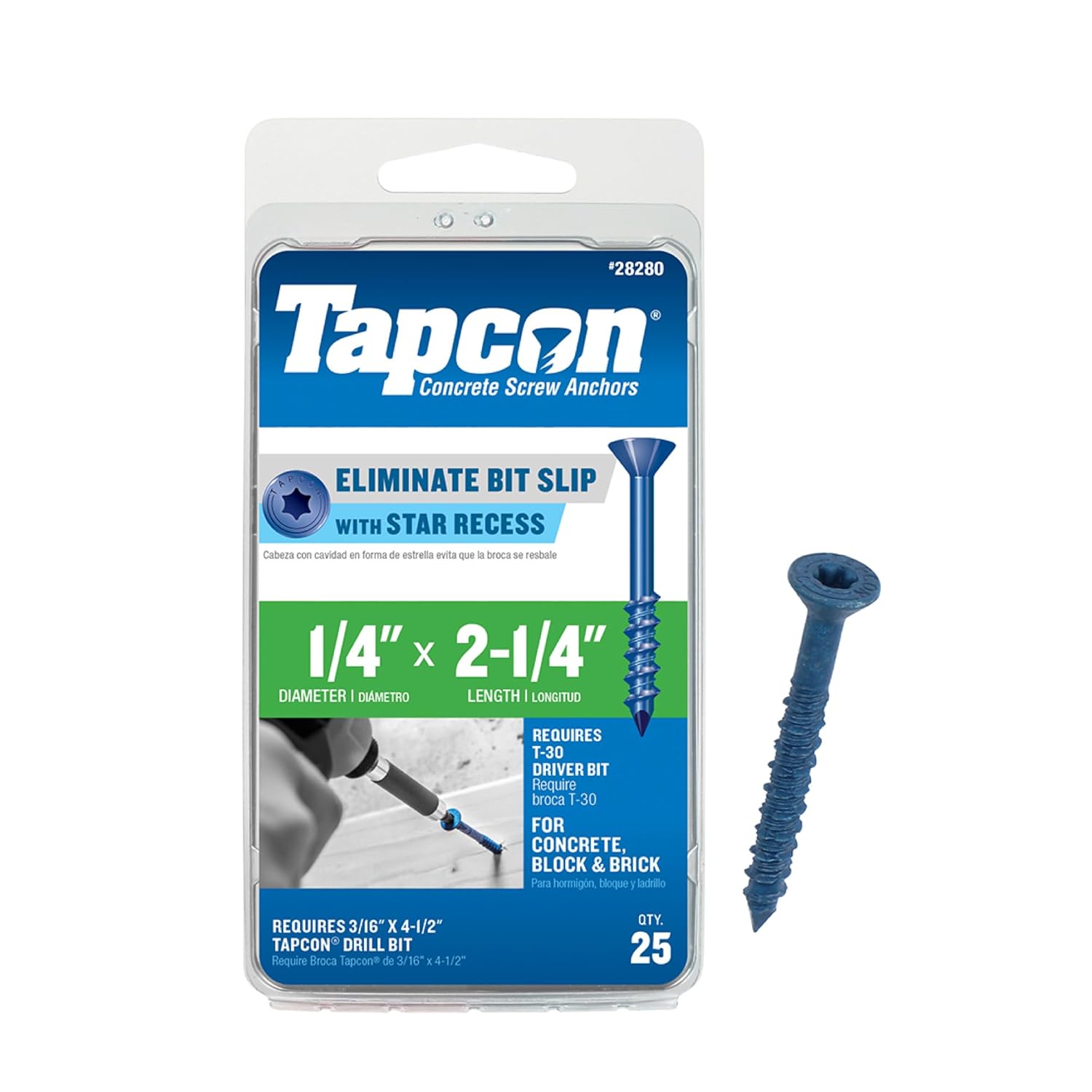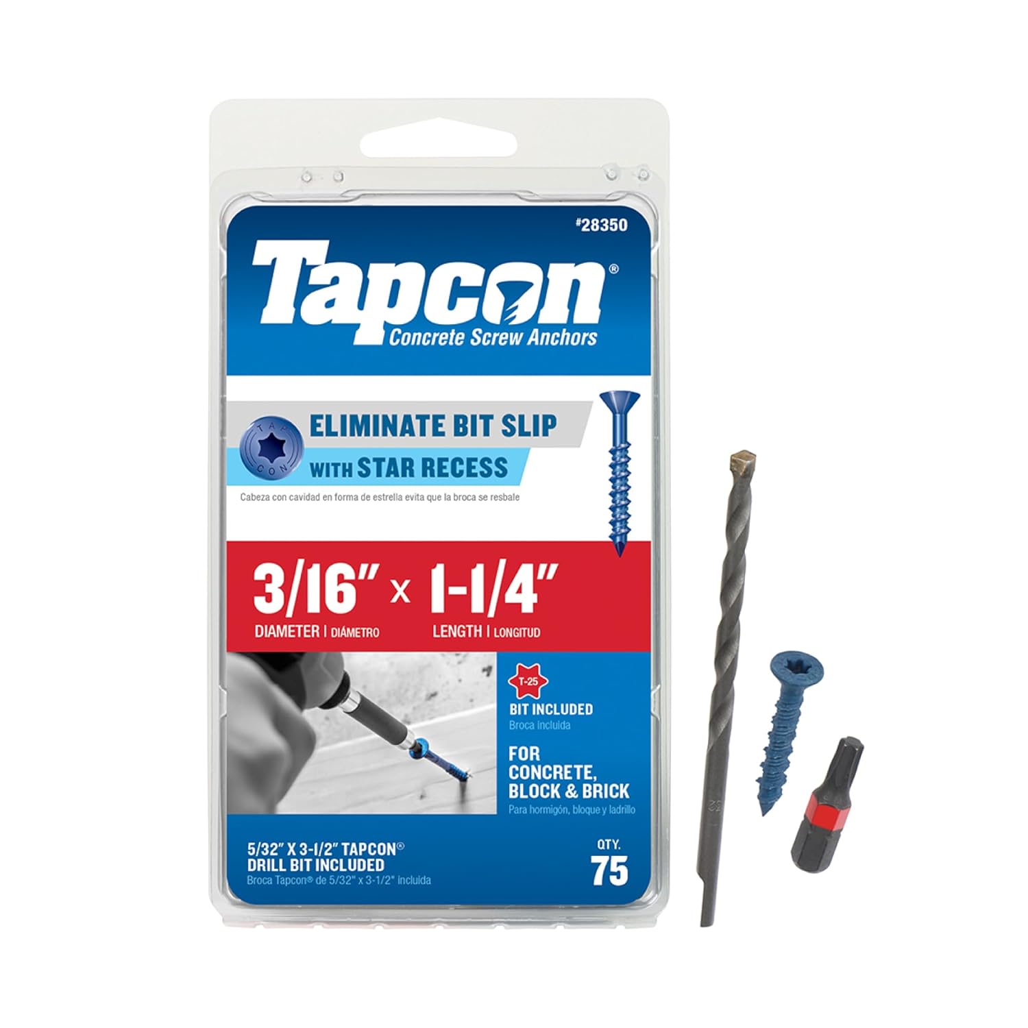 As the original concrete screw anchor that revolutionized the construction world, Tapcon brand concrete anchors deliver the ease of use, superior precision and the unparalleled performance that professionals demand. With a new star recess to eliminate bit slip, Tapcon drives with ease and the patented thread design allows for quick and successful installation no matter the type masonry substrate anchored into. Use Tapcon concrete screw anchors for wood framing to concrete, electrical equipment, furring strips and many other applications that require fastening into brick, block or concrete.