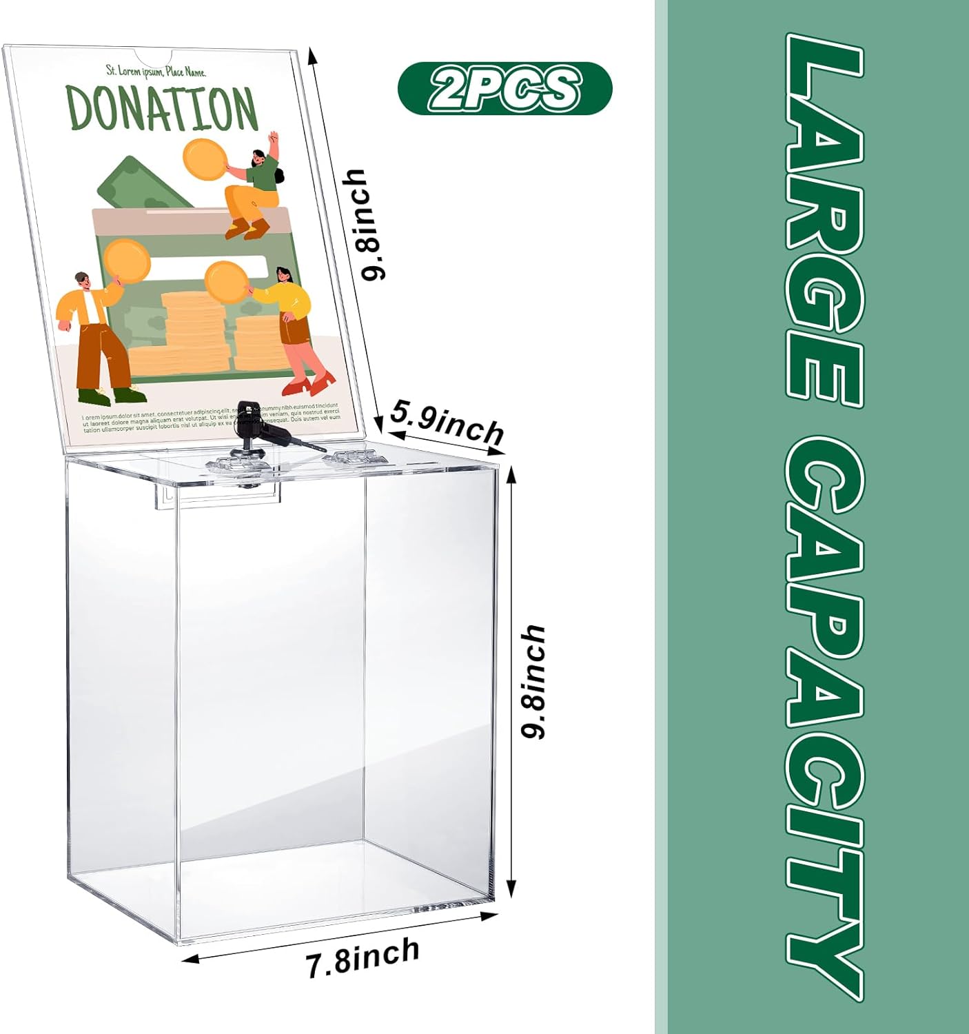 Features: Designed with a convenient slot, this tip box makes it easy for donors to contribute without any hassle. It can be applied for various purposes like fundraising, charity events, tip collection, suggestion box, and more, making it a versatile solution for any organization or event. The included key and lock of raffle entry boxes provide an added layer of security, ensuring that the collected donations remain intact. The lock can be easily opened and closed by authorized personnel, allowing for a smooth and hassle free donation process. Specifications: Material: acrylicColor: clearSize: Box: 5.9 x 7.8 x 9.8 inchesSign plate: 7.8 x 9.8 inchesPackage includes: 2 x Acrylic donation boxNotes: Manual measurement, please allow slight errors on size. The color may exist a slight difference due to different screen displays. Please understand that tickets in the picture are not included.