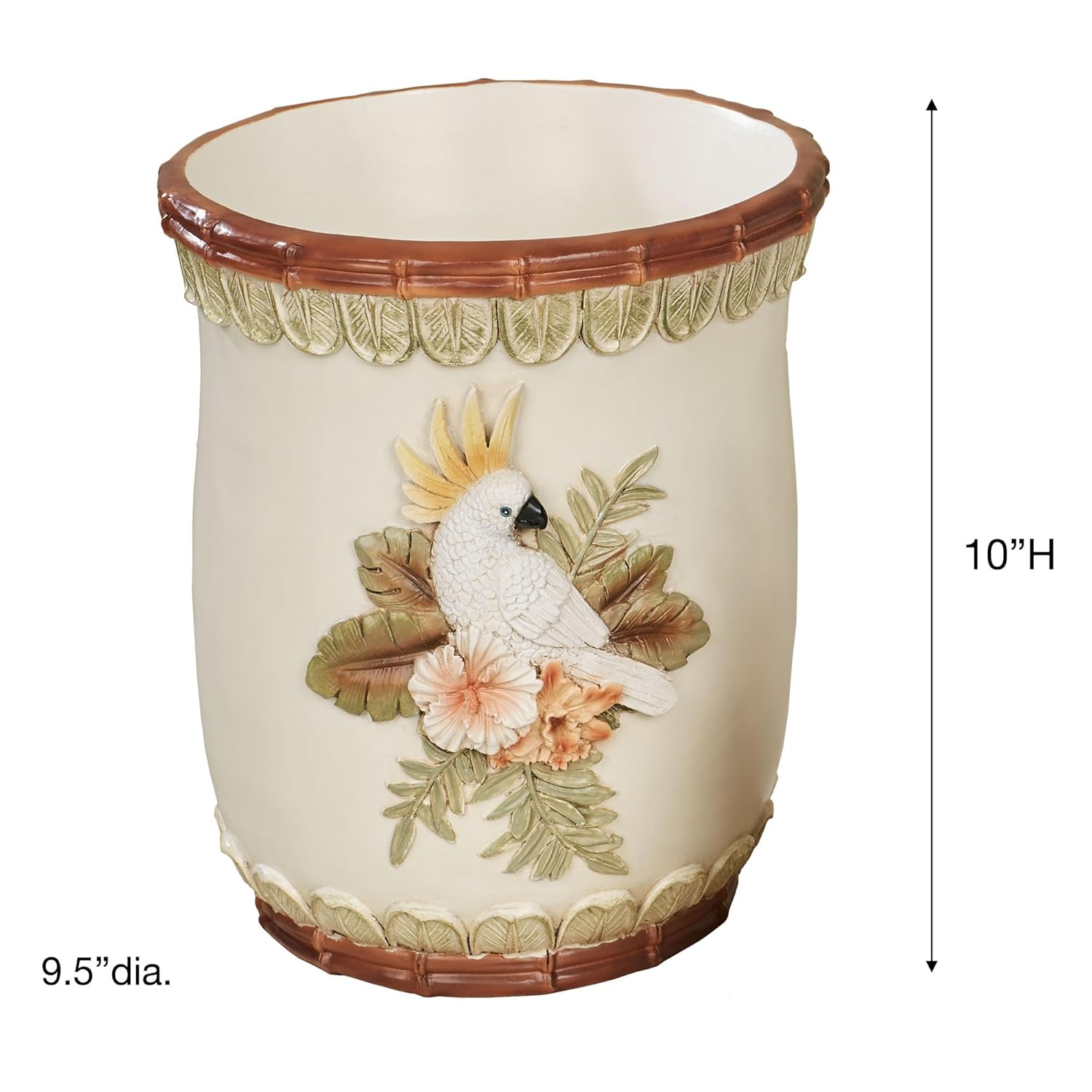 Embrace the beauty of the Garden Tropics with charming feathered friends. Handpainted with lovely detail, each ivory resin bath accessory features dimensional designs of burnt orange and ivory tropical florals and green palm leaves. One side has a black toucan bird in the flora, while the other has a white cockatoo. Bamboo-like trim and more palm leaves surround the edges. Bath accessories are sold individually. Lotion/Soap Dispenser is 4 dia.x9 H. Tissue Cover is 6.5 Wx7 Dx6 H. Wastebasket is 9.5 dia.x10 H. The Tissue Cover is not available at this time due to a delay in stock arrival. Please check back in a few months. Designed by Touch of Class(R)! Handpainted with lovely detail Dimensional tropical bath accessories Charming toucan and cockatoo birds Designs include palm leaves, flowers, and faux bamboo.