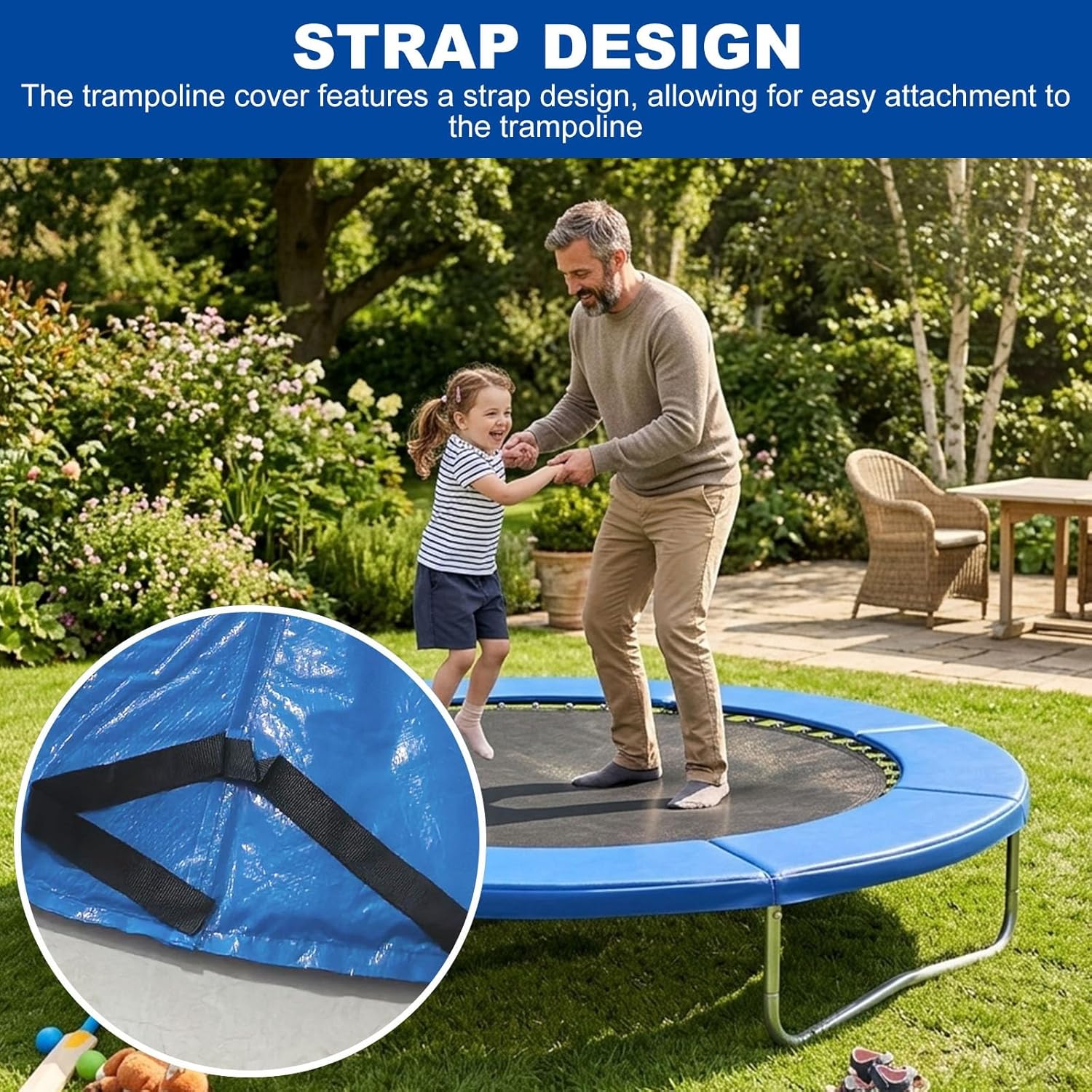 Multiple sizes available to fit different trampolinesPremium PVC material with pearl cottonProtects trampoline springs and edgesSecuring straps for easy attachment, no slippage during useFoldable design, saves storage spaceSuitable for both indoor and outdoor useSpecifications:Product Name: Trampoline Pad ReplacementColors: BlueMaterial: PVC, Pearl Cotton, PESizes: 6FT, 8FT, 10FT, 12FT, 14FT, 15FT, 16FTPackage Contents:1 x Trampoline CoverNote:1. Please understand that there may be a slight error of a few centimeters.2. Due to differences in monitors, the actual color of the product may vary slightly. Please refer to the actual product received.