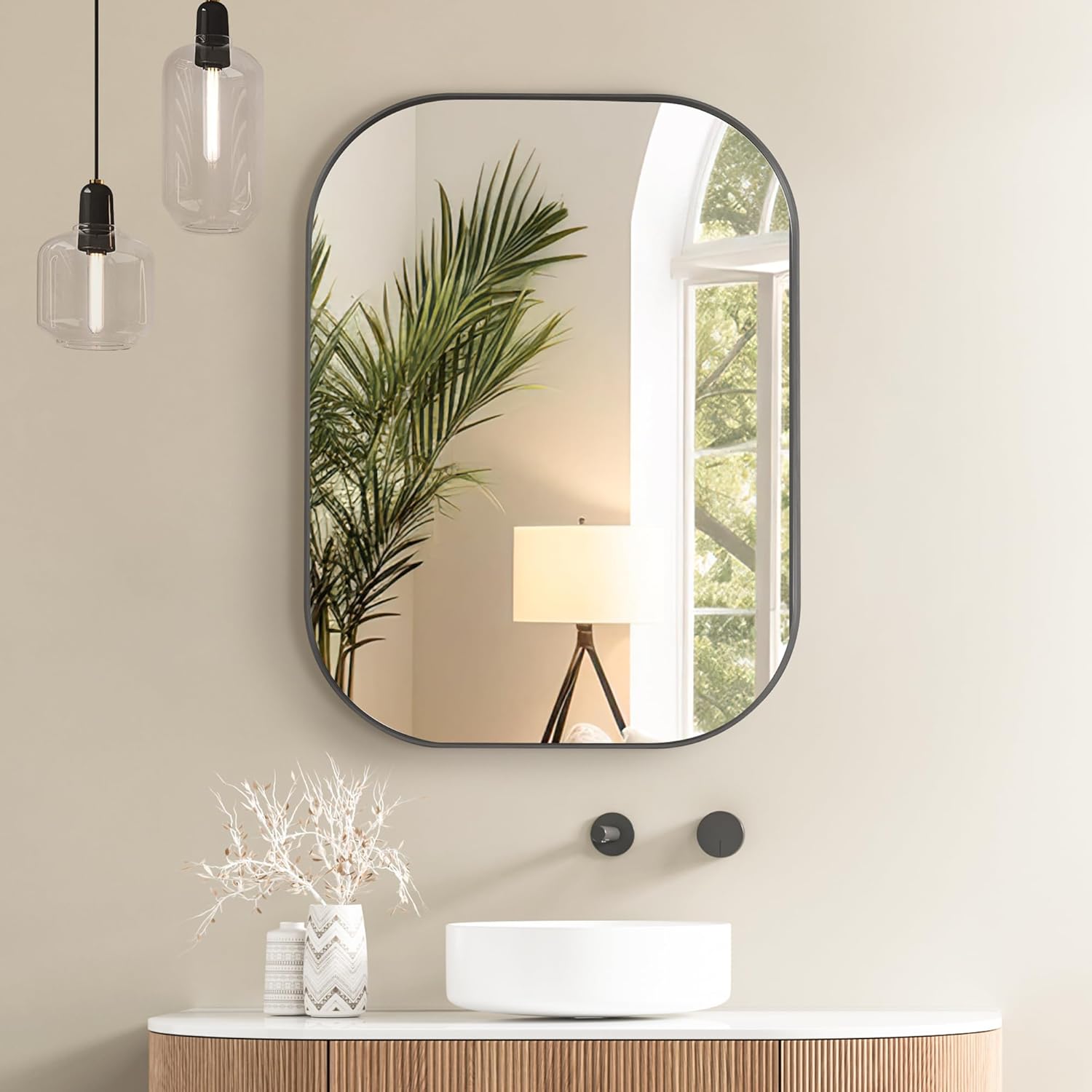 Whether hung in your guest washroom or master bath, our Trielle Wall Mirror adds a polished touch to any space. The sleek, rectangular design enhances the flow of natural light, making the room feel more expansive. The rounded edges give it a unique yet sophisticated, modern aesthetic. Framed with a slim aluminum band, the mirror boasts a clean and elegant silhouette. For added convenience, our Trielle mirror comes equipped with a Z-bar hanger, providing a versatile and effortless installation.Features:- Crafted with a durable aluminum frame and an anodized coating, this mirror is both rust- and corrosion-resistant- The fully sealed metal frame enhances stability, ensuring a longer lifespan and superior durability.- Mirror is available in Matte Black, Brushed Gold and Gunmetal finish to match and enhance your décor.- The 5mm copper-free mirror features a safety film on the back that prevents glass shards from scattering in the unlikely event of breakage.- The smooth curves enhance its refined look while providing a timeless appeal.- Mounting brackets are included for both vertical and horizontal installation.- Minimal assembly required. Installation instructions, hardware, and mounting bracket are included on the back.- Designed to suit your preferences, this mirror complements a variety of décor styles, including modern, glam, industrial, farmhouse, and rustic.- Perfect for any room, this mirror can be installed in your bathroom, living room, bedroom, dressing room, hallway, and more- Full Warranty: 1-Year Manufacturer Warranty—purchase with peace of mind.Specifications:- Shape: Rectangular- Adjustability: Perfect for vertical hanging.- Warranty: 1-Year Manufacturer Warranty