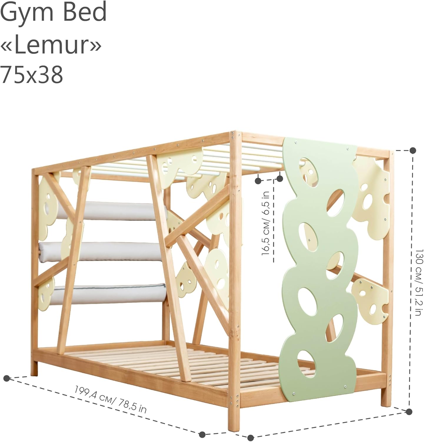 The Lemur Bed by Busywood is designed in accordance with the Montessori methodology, with attention to the growing child's needs. This bed features climbing elements that provide a safe and enjoyable play space, making it the perfect choice for your child. The bed combines comfortable sleep with additional climbing levels and secure railings on the top level. Lemur Bed is available in the USA Twin 75 x 38 in size.The parameters you have chosen represent the mattress (not included) size, but the bed size will be larger than these dimensions. The maximum weight for the sleeping place is 264,6 lbs / 120 kg. The weight capacity for the bed roof is 110 lbs / 50 kg. We recommend using a mattress with a thickness of 20 cm / 7,9 in. -Watch your little one during active play on the bed frame. -Sold disassembled, assembly required. Tools included.