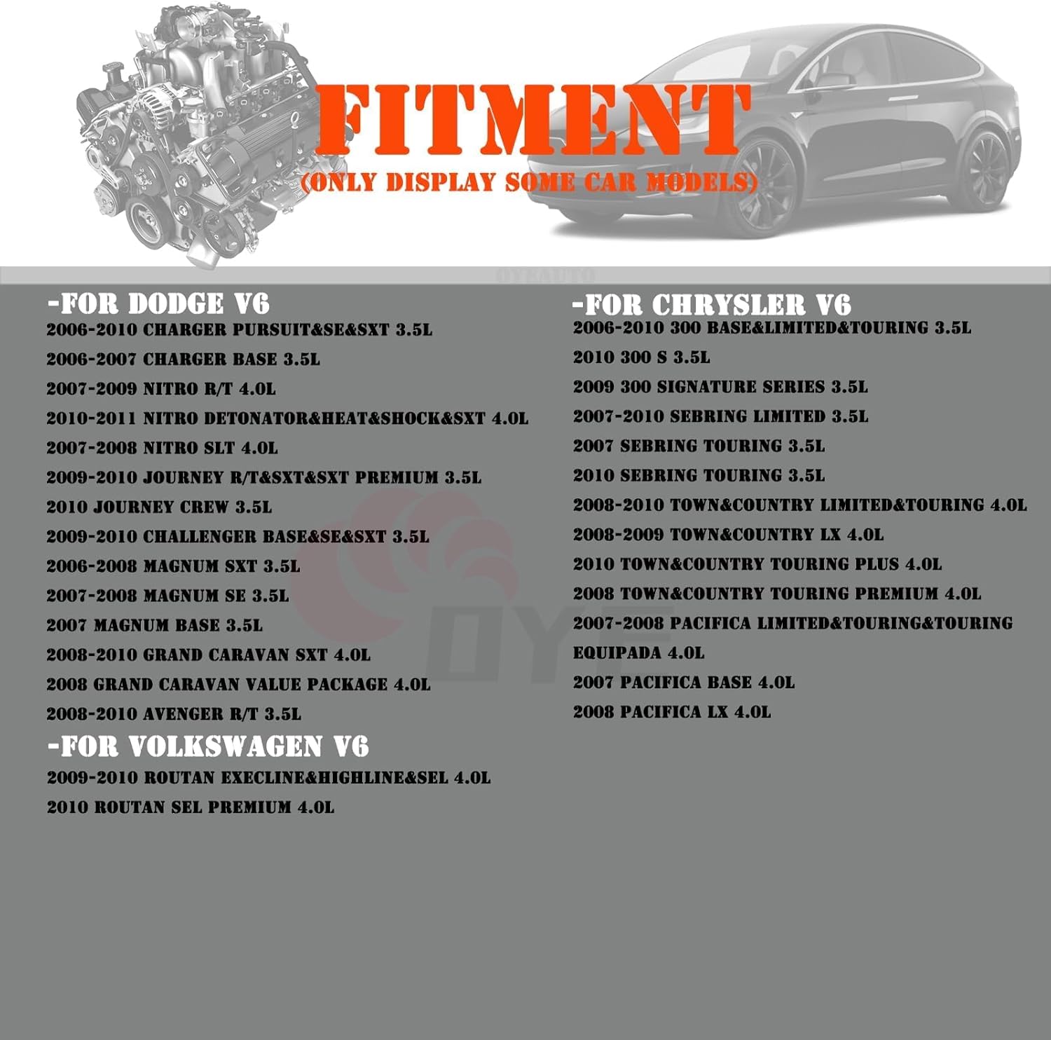 | Part Interchange Info | Replace part numbers: 04606869AB,4606869AB,4606869AC,4606869AD,GN10310,5C1565,7B0905715,04606869AA,7B0905715D,04606869AC,CUF502,80472800169. Applicable for Dodge, Chrysler, and Volkswagen engine models as listed in 'Fitment1' and 'Fitment2'. |