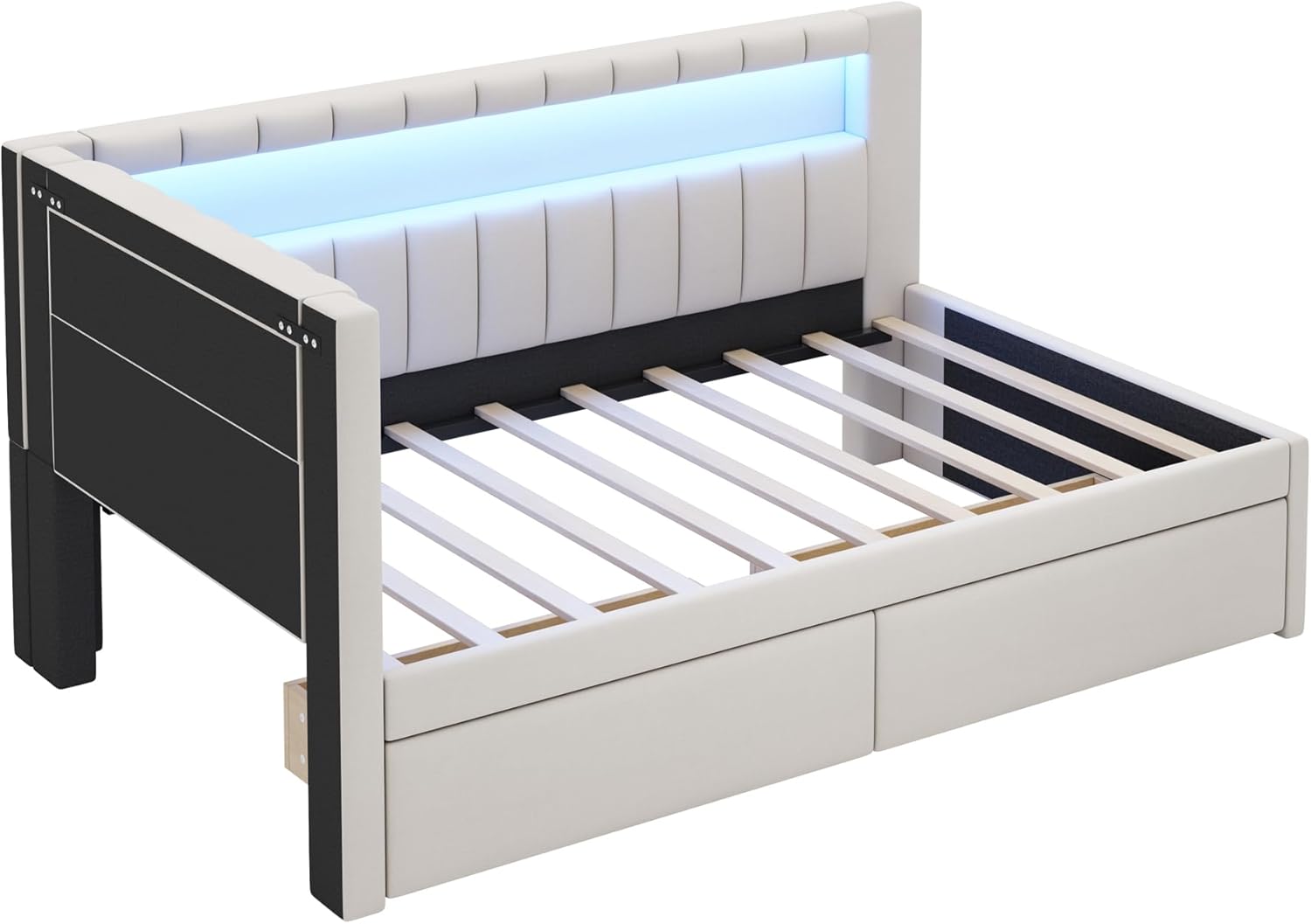 This platform bed frame comes with linen cover backrest and is designed with a clean silhouette and a hue of elegance. It suits all styles of home decoration, and completes the look of any bedroom. This daybed comes with 2 Drawers, easy to pull out, and a multi-functional piece of furniture ideal for small living spaces. Description Material: Linen + MDF Size: Twin Color: Pink/White Numbers of Package: 2 Spring Box: No need Assembly Required: Yes Origin: China Dimensions Overall Product Dimension: 80.7''L x 44.4''W x 38.8''H Twin Bed: 75.5'' x 38.9'' Total Height: 38.8'' Number of Bed Slats: 12pcs Recommend Mattress Thickness of Bed: 6'' Overall Product Weight: 120lbs Bed Weight Capacity(Upper/Trundle): 250lb