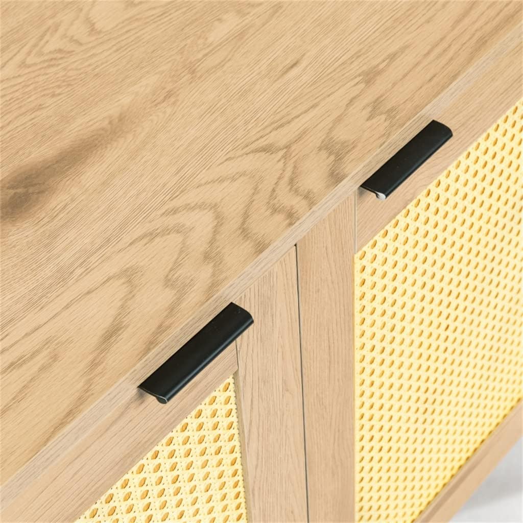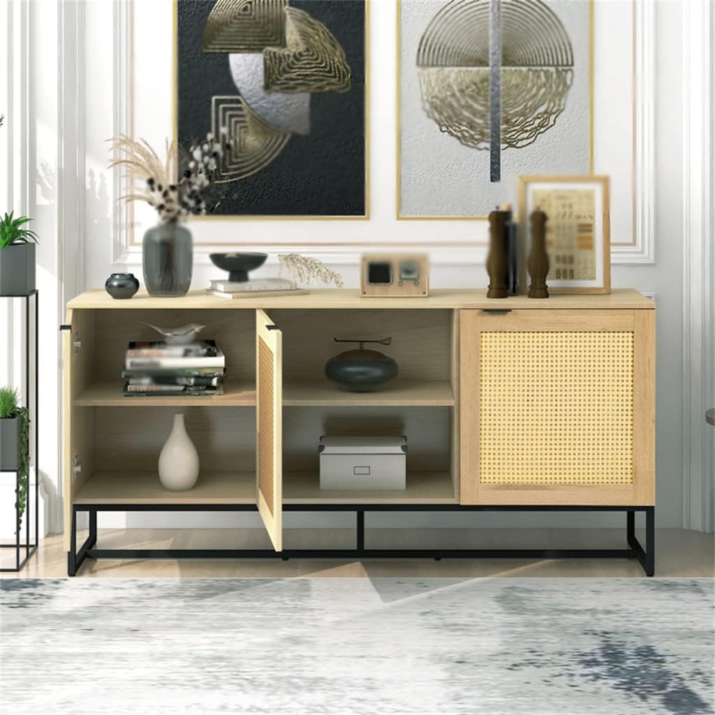 This sideboard can add additional cabinetry to your dining space, living room. The sideboard consists of 3 separate sections, each with a separate door. Each section has ample storage space, and a partition divides the space into two levels. This design optimizes storage space. Made of MDF board with textured wood grain, the doors are decorated with artificial rattan strips in the middle of the ends. The iron frame has adjustable feet at the bottom to ensure stability in use. This sideboard features rattan drawers, which not only provide additional storage space for storage, but also make the room look more stylish. Material; MDF + iron frame + wicker Size: As shown Package Includes. 1 x Kitchen cabinet (Other demonstration items not included). matters need attention: 1. Please allow a 2-3% error due to manual measurement, and make sure you don't mind before you bid. 2. Color may vary by display, please refer to the actual product.