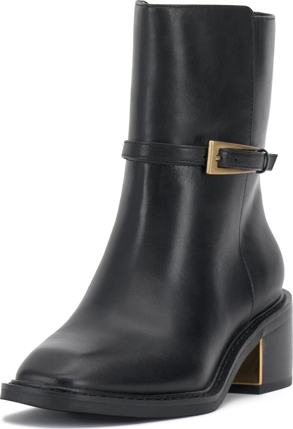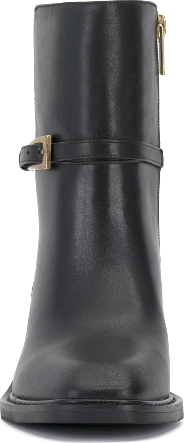 The riding boot becomes a bootie. Who knew this is what you always wanted? Like it's tall shaft counter part, Gini, it has a tapered toe, 1.77 in stacked block heel with interior metal rand, and comfort sock. Also, the boot is detailed with belting though thinner and a buckle though thinner and more elongated. Key difference is the shorter shaft measuring only 6.5 inches. So, if you want the riding boot look without the height, this is the bootie for you.