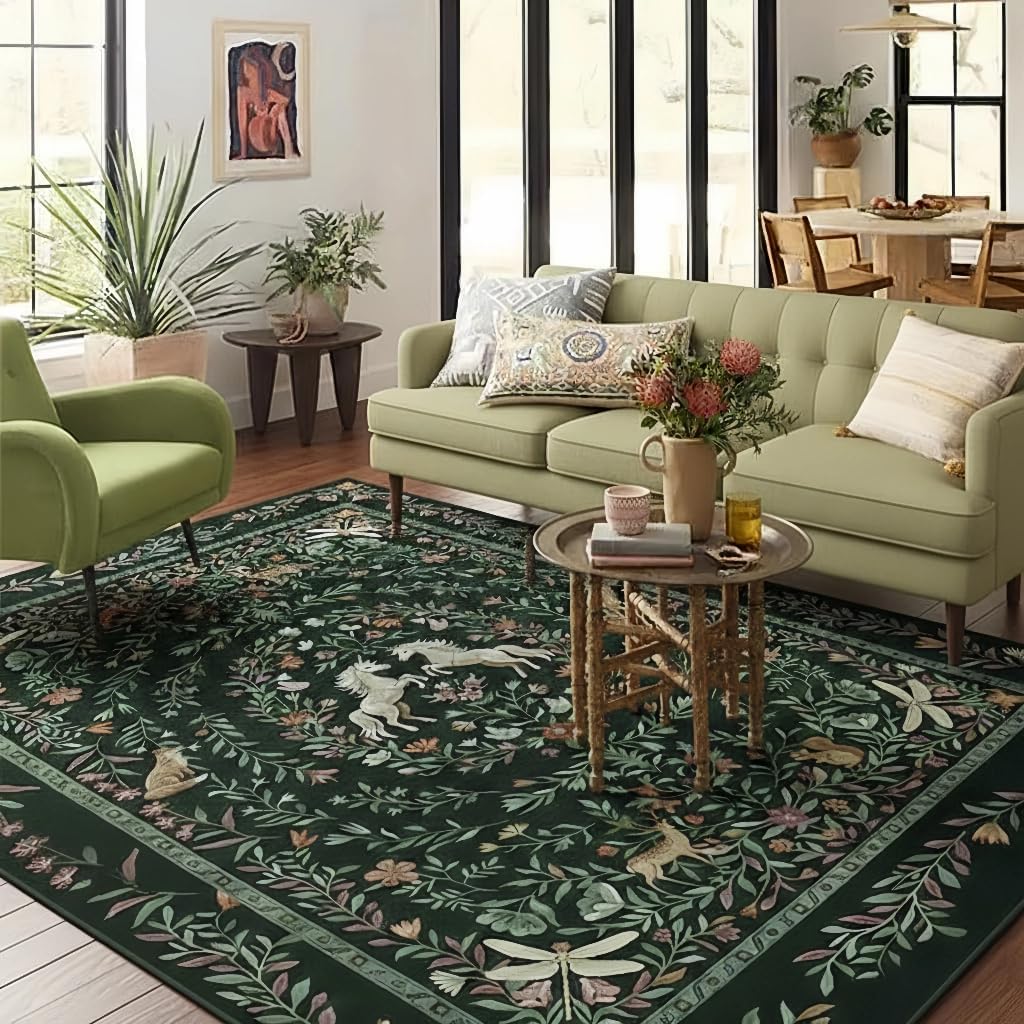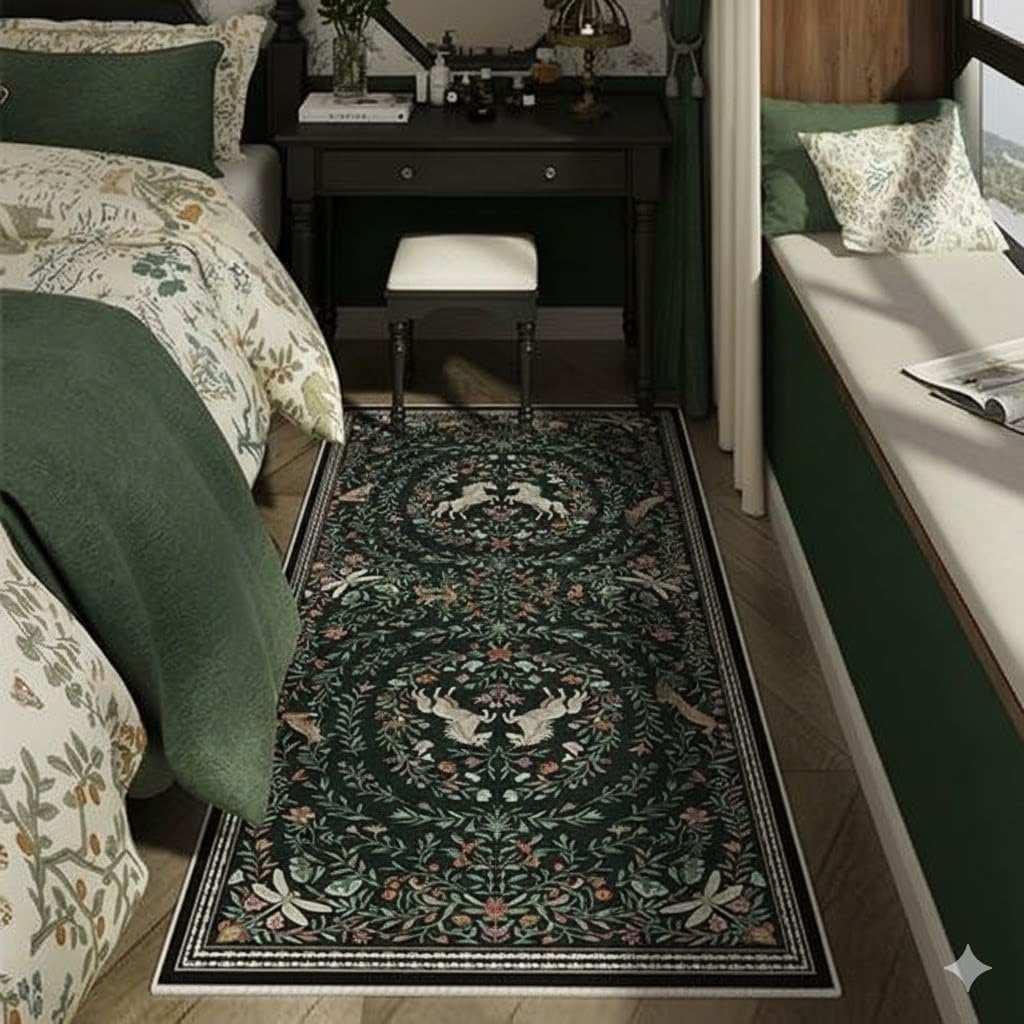 Transform your living space into an enchanted garden with this exquisite 2*6 runner rug. Featuring a captivating vintage boho design, the rich, dark green backdrop sets the stage for a whimsical scene of graceful birds nestled among a lush floral tapestry. This rug is more than just a floor covering; it's a piece of art that infuses any room with a storybook charm, perfect for creating a unique focal point in your home decor. Crafted for both beauty and practicality, the rug boasts a soft, low-pile surface that is comfortable underfoot. The non-slip rubber backing ensures safe placement on hardwood or tile, providing peace of mind for households. Best of all, maintenance is effortless—its stain-resistant and machine-washable nature makes cleaning simple, ensuring your beautiful rug stays vibrant for years to come. Ideal for the living room, bedroom, or entryway, it brings a touch of durable, magical elegance to your daily life.