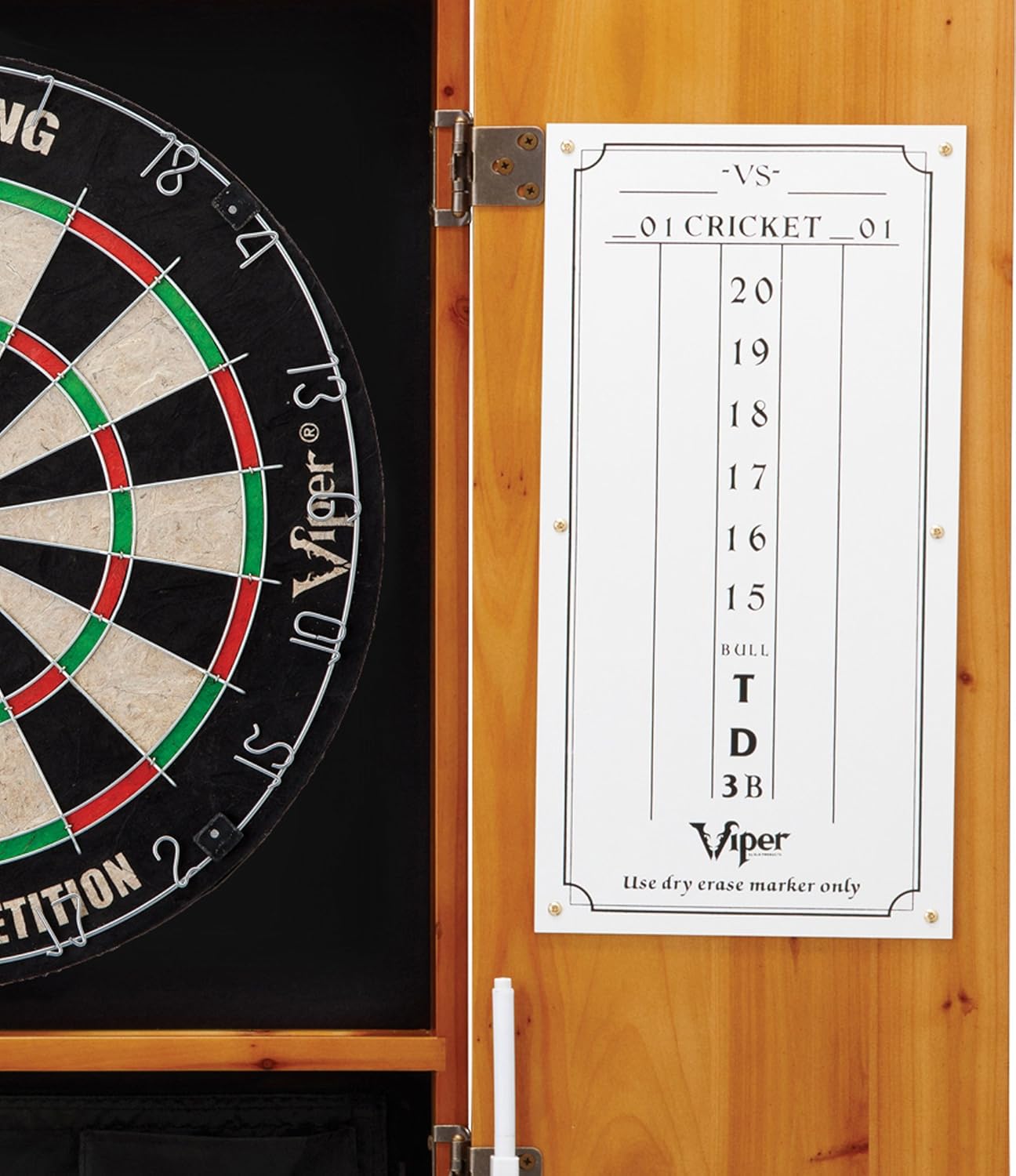 Everything you need to optimize your darting experience is now available in a convenient, comprehensive bundle. Choose either just the premium dartboard cabinet or a bundled set which contains the same dartboard cabinet and a sisal/bristle staple-free bullseye dartboard. Each cabinet includes a dry erase scoreboard, out-chart board, dry erase marker and mounting hardware. The Viper Metropolitan dartboard cabinet features a black felt lining and is available in 4 wood finishes (cinnamon, espresso, mahogany and oak). Crafted with solid pine, box joints and bronze hinges, this cabinet's quality construction provides lasting durability and complements the look of any room. It's fitted with 2 compact door stoppers which help protect the dartboard and cabinet from a door slamming shut. Open dimensions: 42" L x 27.5" W x 3.5" D; closed dimensions: 21" L x 27.5" W x 3.5" D. Measuring 18" in diameter, which is official tournament size, each dartboard features a staple-free bullseye which greatly reduces bounce outs. It's constructed from self-healing sisal/bristle fibers compressed together, providing unsurpassed durability. A movable number ring further extends the dartboard's life. All bundles (with the exception of just the cabinet only and the standard bundle) include 1 set of Viper Black Mariah 22 gram steel tip darts. They are designed with black coated brass barrels that deliver exceptional balance and styling. Strategically placed knurling and grooves provide excellent gripping points, enhancing your control. Each dart features an aluminum shaft featuring locking holes which deliver a tight connection that improves stability. The Elite bundle includes a Viper laser throw/toe line marker. The bright and energy efficient lighting of the laser allows it to be seen even in intense daylight. The adjustable laser throw/toe line provides a modern alternative to traditional adhesive floor markers. Once the laser is mounted, simply tighten the 2 screws on either side to ensure it stays in place, even if it is bumped.