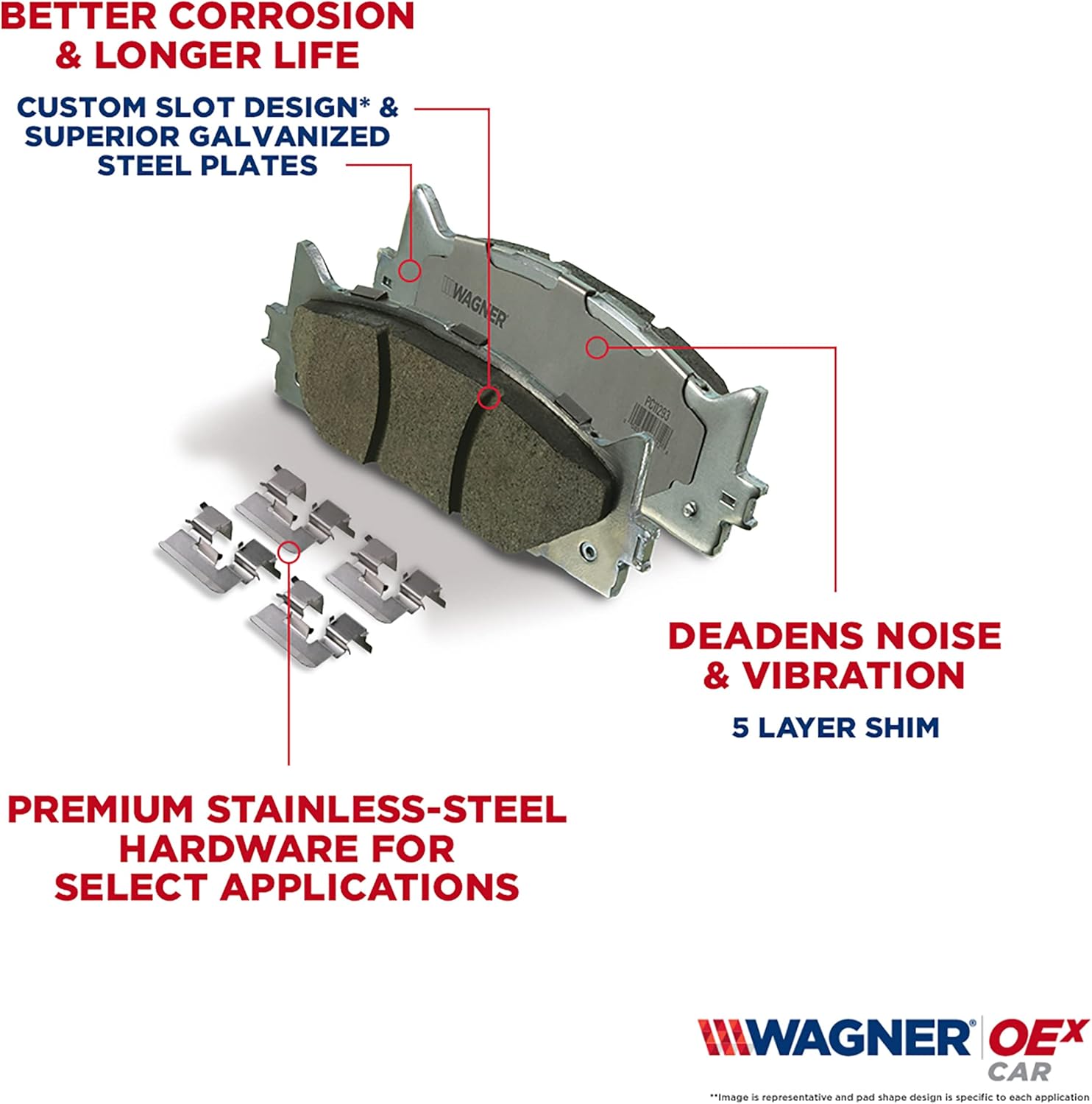 Wagner OEX Car brake pads provide premium braking performance for passenger cars. Features reduced-copper formulation and advanced, customized slot design that optimizes debris escape opportunities for longer pad life based on independent trials.