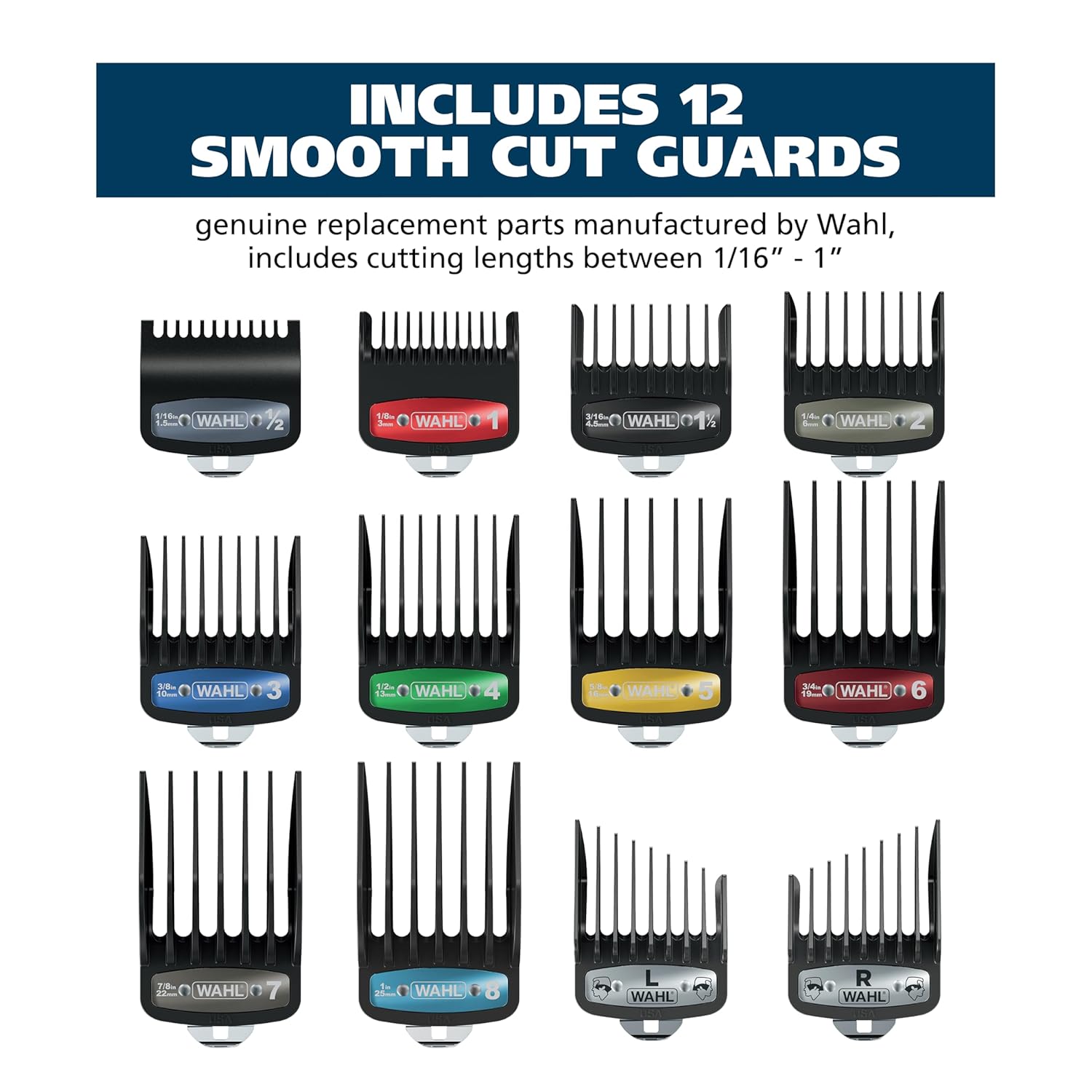 The genuine Wahl Clipper attachment guards with organizer storage kit is the upgrade you need for your home barbering experience. Wahl’s SECURE-SNAP® guide combs with metal clips are an upgrade to your existing hair clipper guide combs; Organizer conveniently and hygienically stores all the included hair clipper guards. Sturdy guide combs make a big difference in how your hair clipper glides through your hair, high quality guide combs can help reduce snagging and pulling. Each individual clipper guard has its own place in the organizer, less fumbling around with loose guide combs in a messy and hairy clipper storage case. Full Set of hair clipper guide combs range in size from 1/16” to 1” with left and right ear attachment guards as well as a sturdy and convenient organizer. For over 100 years, Wahl hair clippers and beard trimmers have been used by professionals in the barbering and salon industry