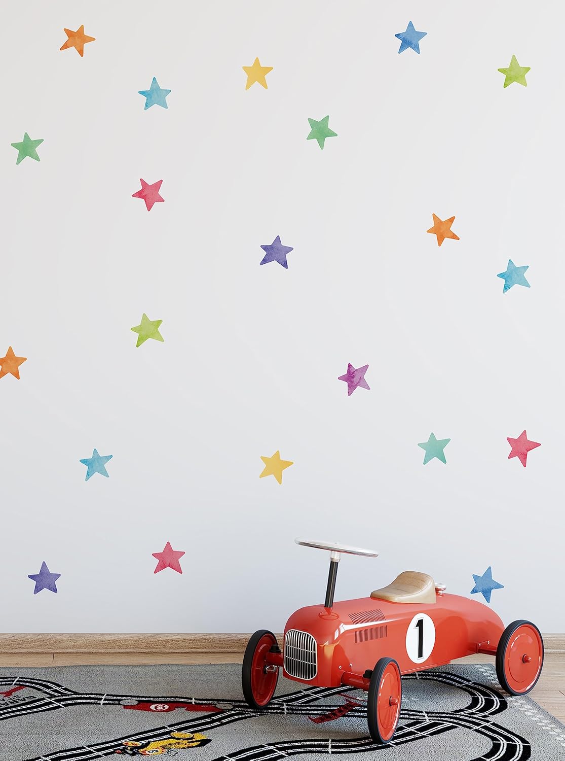 Make your little one feel at the center of the universe with Simple Shapes’ Watercolor Stars peel and stick decals. Available in a variety of colors, each sticker is printed on a premium adhesive backed fabric that can easily be removed, reused and repositioned. Free of any mess, stress or sticky residue that comes with traditional stickers and wallpaper, enjoy a seamless experience arranging each piece around the room exactly how you like! Each set includes 60 stars. Size: Star Size: 3.3" What's Included (60) Stars IMPORTANT INFO CLICK TO READ • Printed on premium adhesive backed fabric— just peel and stick! • Designed and produced in Ramsey, New Jersey, USA. • All of our stickers can be re-sized larger or smaller. us for pricing. • Stickers can be used on slightly textured walls. See our for detailed information. • Stickers are long lasting, easy to remove, and leave the paint mark free. They are also reusable! • Wall stickers may be returned or exchanged within 30 days of purchase. See our for more details.