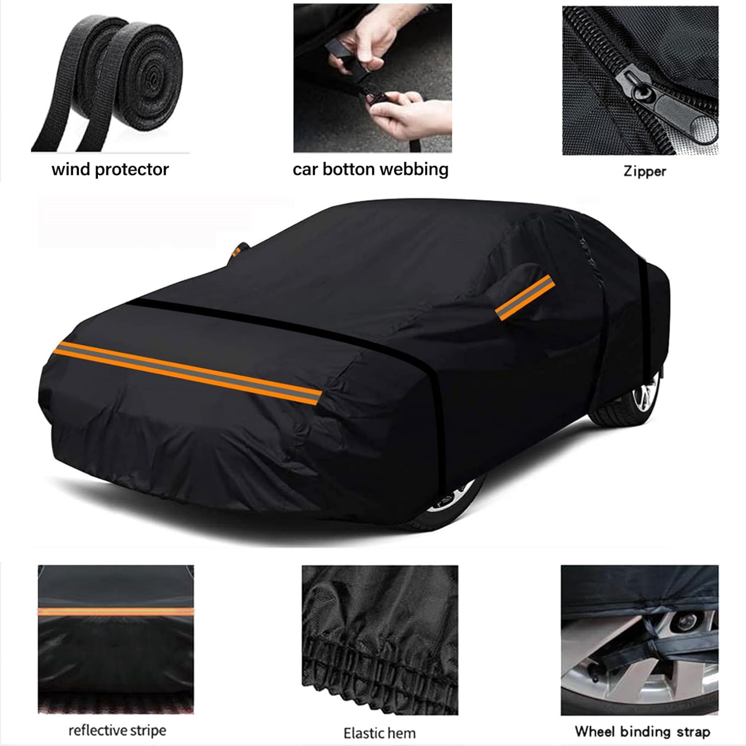 Feature:Thicker Buckles, plastic for strength and can holds up to 300lbsStrength straps have a breaking strength of up to 1000poundsGood protection against wind with dust, sand, and otherIt has a unique reflective stripe to ensure high visibility in low light conditionsHigh quality, washable, and durable to useThe 600D Oxford cloth fibers are very tight, which already makes it difficult for water to penetrate, plus the smooth PU coating, which completely isolates the water outside the car cover, making it completely waterproof. Even in the case of a sudden storm, there is no need to worrySpecifications:Color: BlackMaterial: 60D Oxford FabricCoating: PU CoatingSize: Compatible with Sedan Length 175-185 inches 185*70*56 inchCompatible with 1994-2025 F-ord MustangCompatible with 1990-2025 M-azda MX-5Compatible with 1998-2025 H-onda Civic SedanCompatible with 1984-2019 C-orvette C4 C5 C6 C7Package:1 x Car Cover1 x Storage Bag