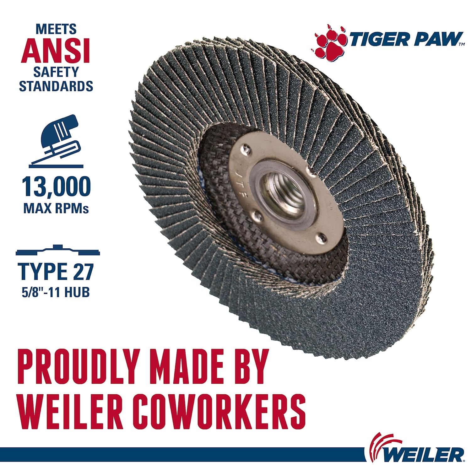 Weiler Wolverine flap discs are designed to deliver fast material removal and consistent performance at a great value. The improved design provides up to 25% more life over the previous Vortec Pro line. Wolverine gets the job done for fabrication professionals, aggressively grinding and blending carbon and stainless steel in every-day applications.Typical applications: Flat surface grinding, light pressure finishing/blending, weld grinding/blending, general stock removal, finishing, irregular surfaces.Benefits of Wolverine Flap Discs:• Fast Cut Rate – Zirconia Alumina grain is self-sharpening, delivering aggressive grinding from start to finish• Increased Life - Improved design results in 25% longer life over previous Vortec Pro flap discs• Versatility – Choose between type 29 or 27 styles for an optimal angle of approach and desired finish as well a variety of backing options, arbors and available diameters to fit all tool sizes.• Fast Change Over – Available with a quick-change 5/8" -11 nut in addition to 5/8" and 7/8" arborsFAMILY OWNED SINCE 1879Weiler Abrasives Group, originally named Weiler Brush, was established in 1944 with fifty dollars and a big dream. We're still privately owned and operated by our fourth-generation CEO, Chris Weiler.DELIVERING EXCELLENT PRODUCTSWeiler Abrasives Group manufactures products that enable end-users to optimize what they do best to achieve their highest efficiency. Click on the "Visit the Weiler Store" link at the top of this page to see the full line of abrasive products from Weiler.