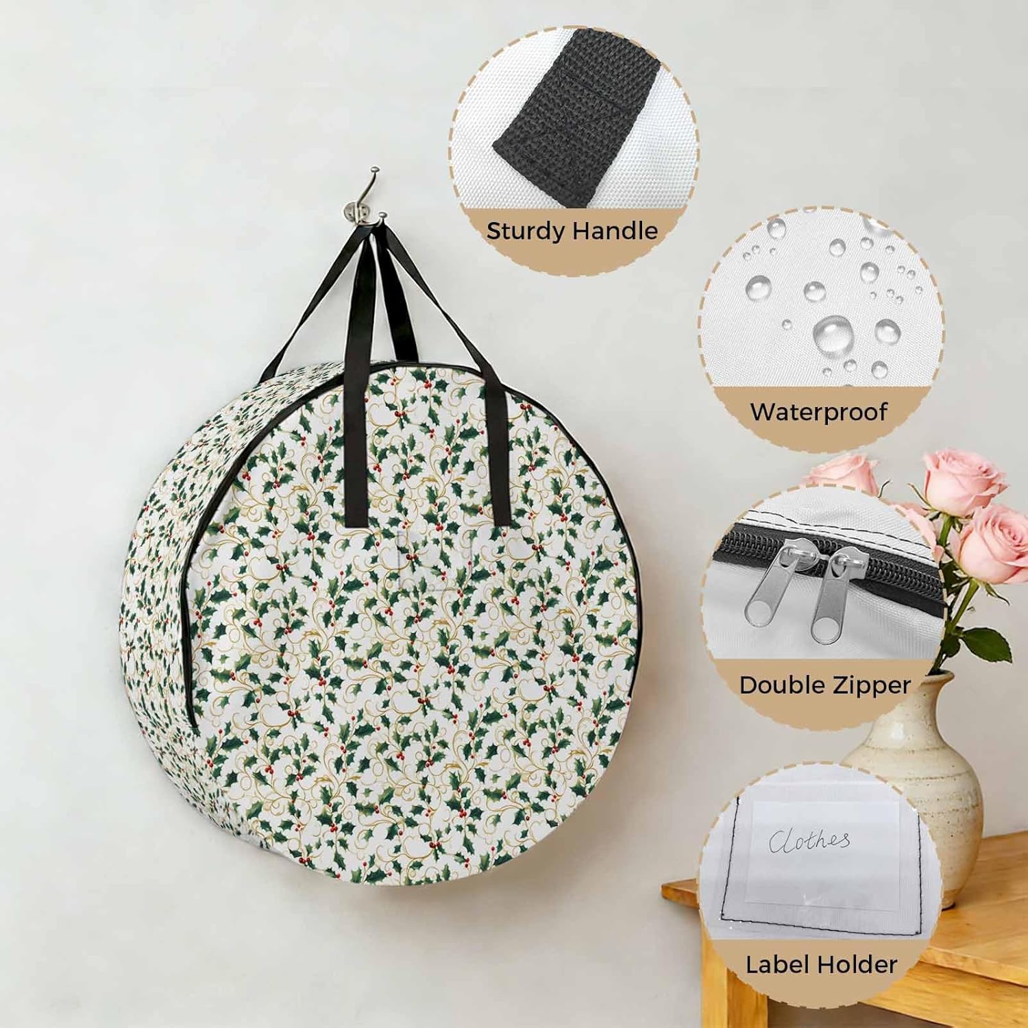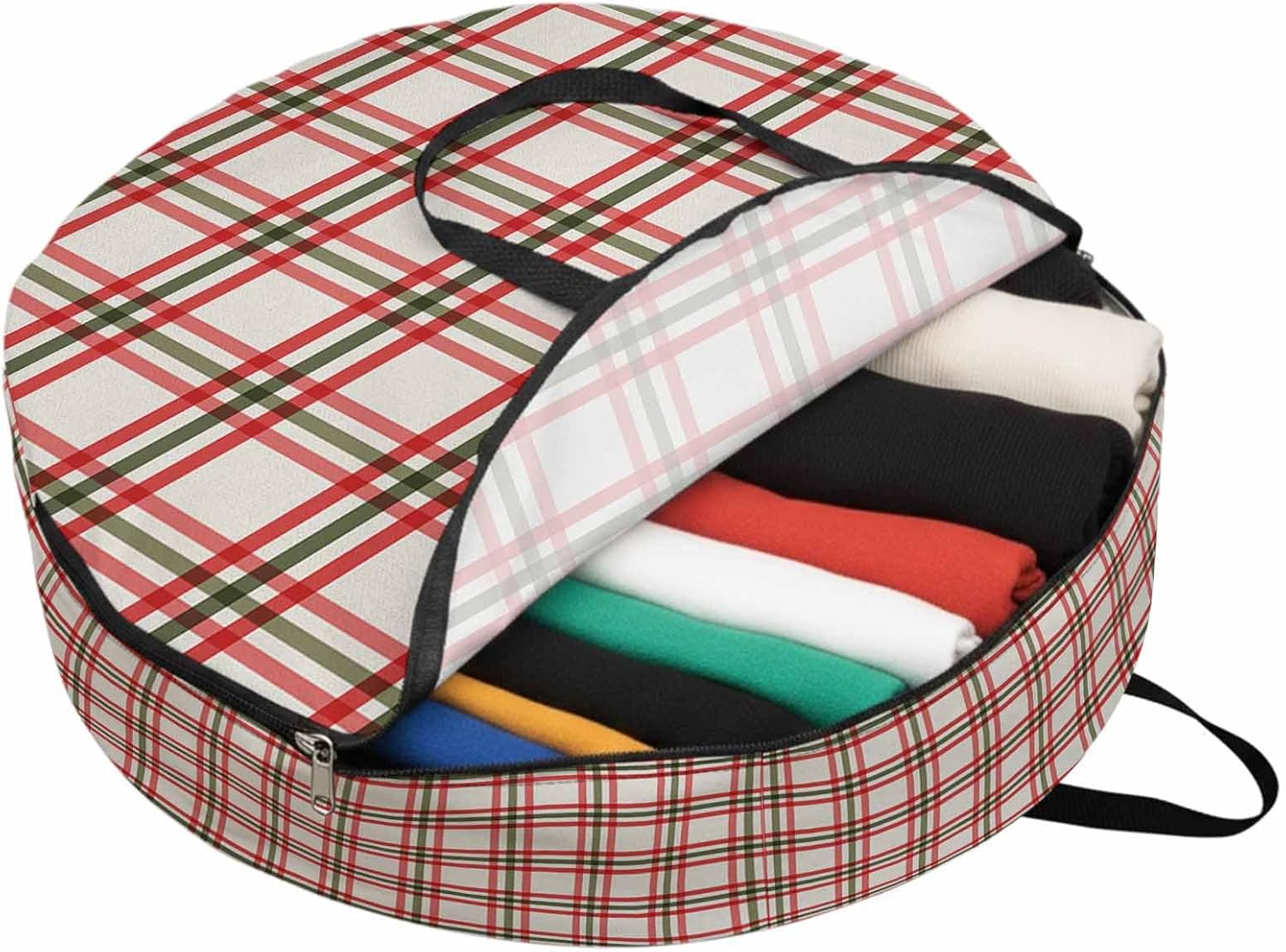 Reclaim Your Closet Space with the Round Storage Solution! Material: polyester Diameters: 24 inch, 30 inch, 36 inch Depth: 7 inches Package Includes: Round Storage Bag One Bag, Endless Possibilities: Whether you are swapping out your summer wardrobe, moving into a new dorm, or packing away holiday decorations, this bag has you covered. The circular design is uniquely suited for: Bedding: Comforters, quilts, sheet sets, and oversized pillows. Clothing: Winter coats, sweaters, and bulky ski gear. Home Decor: Holiday wreaths, garlands, and floral arrangements. Outdoor Gear: Camping blankets, sleeping bags, and beach towels. Dual Zippers: The high quality double zipper design allows the closet organizer to open wide from both sides, making it effortless to load and unload even the bulkiest comforters or wreaths. Reinforced Handles: Sturdy, reinforced handles are securely stitched to provide extra strength and a comfortable grip when carrying heavy loads or pulling the bag from under a bed. Clear Label Pocket: A transparent built-in label holder allows you to quickly identify the contents of each bag without ever having to unzip it, keeping your storage perfectly organized.