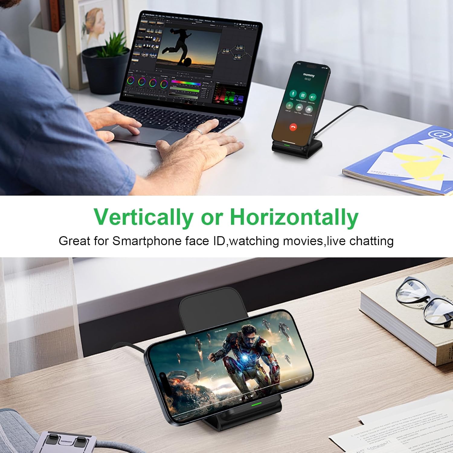 15W Fast Samsung Wireless Charging Stand with 18W Adapter for Samsung, Pixel, iPhone, Moto and Other Wireless Charger Enabled devicesSafe and reliableThis 15w samsung wireless charger station support short circuit protection, overheating protection and more. You can rest assured that your device is protected during chargingWide charging areaCharge both vertically and horizontally, watch videos, listen to music, play games or sending message without interruption during the whole charging process.Case-Friendly designThis Samsung S26 wireless charging stand directly through protective cases up to 5 mm thick (metal case, magnets, credit cards, grips, and stands will interfere with charging)15W Wireless Charging Stand:Input: 5V-2A / 9V-2A / 12V-1.5AOutput: 15W /10W /7.5W /5WWireless Charger Station 4 Charging Models Compatible With :15W Fast Charging Mode:Samsung Galaxy S26+/S26/S26 Ultra/S25/S25FE/S25 Ultra/S24/S24+/S24 Ultra/S23/S23+/S23 Ultra/S22/S22 Ultra/S21/S21+/S21 Ultra/S20/S20+/S20 Ultra/Note 20/Z Fold6/Z Flip6Motorola Moto G Stylus(2025 2024)/G Power 5G(2025 2024)/razr/razr+/Razr 50 Ultra/X50 Ultra Edge/Edge+/Edge 50 UltraGoogle Pixel 10 pro xl/10 pro/10a/9 9pro 9pro xl 9pro fold 8a 8pro 8 7a 7pro 710W Fast Charging Mode:Samsung Galaxy S10/S9/S8/Note10/9/87.5W Charging Mode:iPhone 17/17Pro Max/16/16 Plus/16 Pro Max/ 16 Pro/15/15 Pro/15Plus/15 Pro Max/14/14 Plus/14 Pro Max/14 Pro/ 13 mini/13/13 Pro/13 Pro Max /12 mini/12/12 Pro Max/ 12 Pro/11/11 Pro/Pro Max /X/85W Standard Charging Mode:AirPods 3/2/Pro, Galaxy Buds, Pixel Buds;All other wireless charging enabled phones and devicesNote:This 15w wireless charger pad NOT support Motorola Moto G, Moto G Play, Moto G Stylus 5G(2021 2022 2023), Moto G Power(2026 2022 2023), Google Pixel 5a 6a, Samsung A series (LikesA16 A34 A55 and more)Package Listting:2x 15W Wireless Charging Stand2x 3FT USB A to USB C Cable2x 18W Charger Adapter