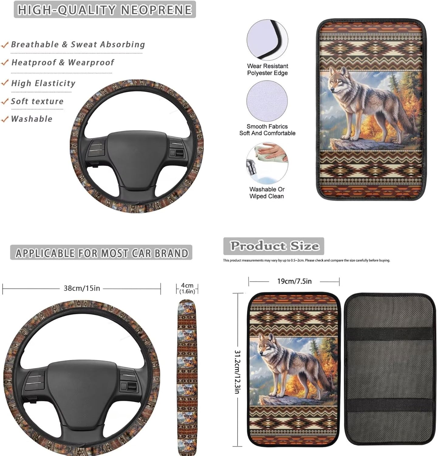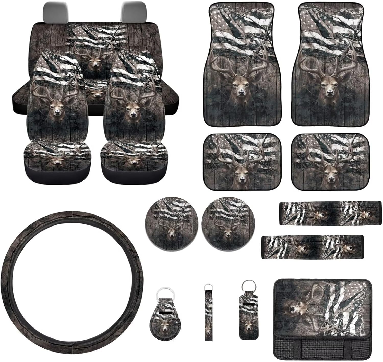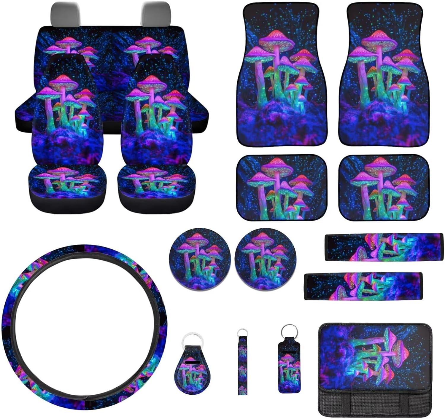 Baxinh 17-piece car seat covers & accessories set, a must-have for enhancing both the comfort and style of your car's interior. What will you get: -4 pieces car seat covers -4 piece car floor mats -1 car steering wheel cover -1 center console pad -2 piece seat belt pads -2 piece water cup coasters -2 piece different keychains -1 chapstick holder Designed for easy installation and a universal fit, our car seat cover sets are suitable for SUVs, sedans, trucks and van. Made from high-quality polyester fabric and neoprene, these automotive accessories are soft and breathable. The stretchy fabric shows the patterns beautifully and will not fade, adding a touch of elegance to your car's interior. With these stylish and functional decorations, you can protect your car seats while enjoying a comfortable and enjoyable driving experience. Customized Services: Unleash your creativity! We offer customized services to bring your vision to life. Share your picture or text with us, and our team will create a one-of-a-kind product just for you! Washing method: Our products can be handwashed. Do not soak for a long time, do not bleach, and the temperature should not exceed 45ºC Note: -Please refer to the product images for proper sizing before purchase. -If you notice any initial odor, simply place the product in a well-ventilated area for a short time, and it will dissipate. -Please allow a little error in the size (usually 1 to 2 cm) due to different measures. -Please allow a little difference of the color due to different light or environment or production batch and machinery.