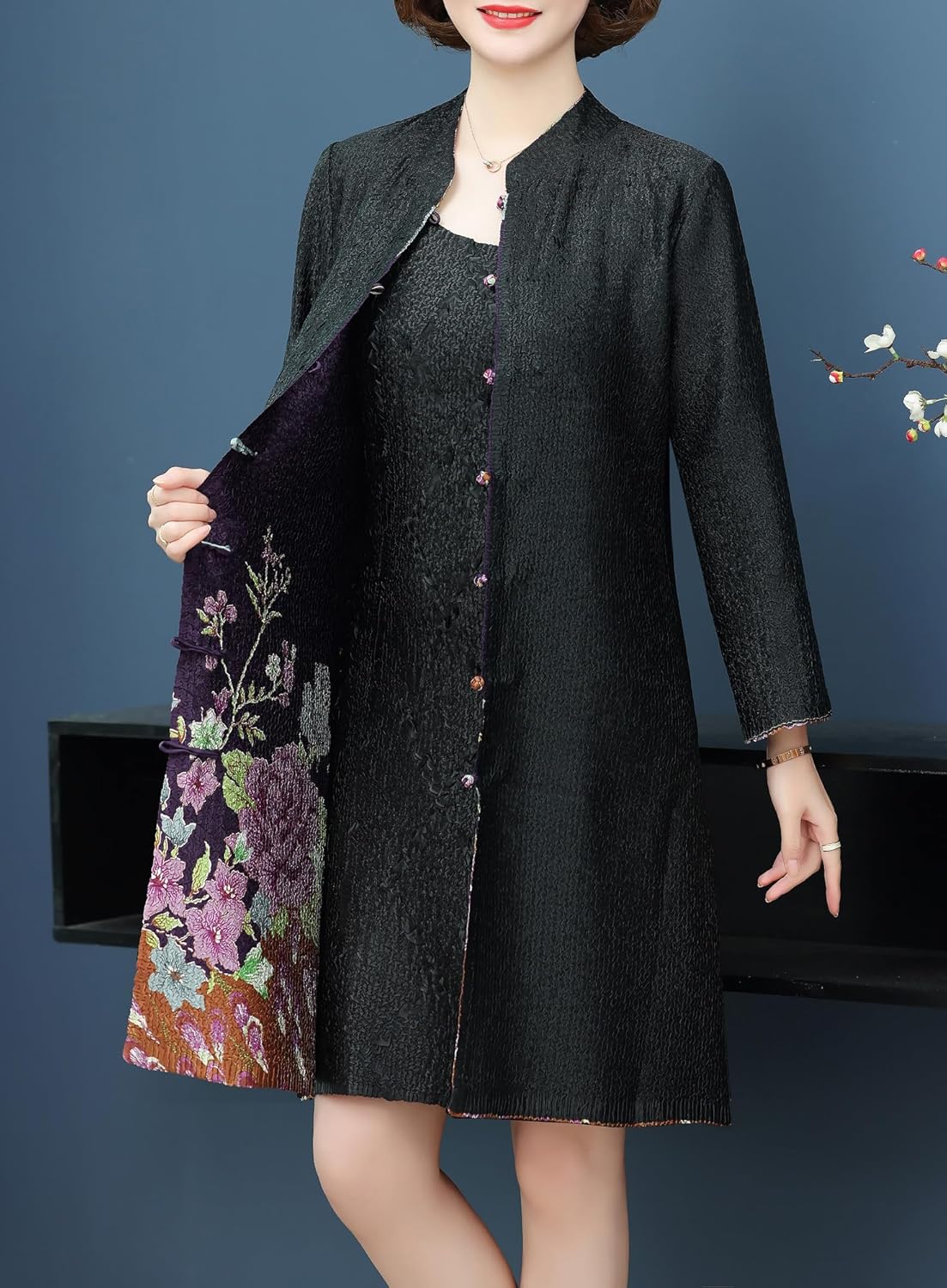 Being a stunning piece that combines fashion with versatility, this jacket is perfect for adding a touch of elegance to your wardrobe. Crafted from a unique, stretchy bubble crinkle fabric, this jacket offers both comfort and style. The lightweight material drapes beautifully, while its crinkle texture adds a delightful dimension to the garment. The colorful flower print is a true standout, featuring vibrant hues that pop against the fabric's subtle wrinkled surface. The fact that it's reversible means you get two looks in one, doubling your styling options. The jacket has a straight cut that flatters various body types and provides a relaxed fit. Securing with Chinese frog buttons, these closures not only pay homage to oriental aesthetics but also add an ornate, functional element to the piece. The blend of lyocell polyester and linen in the fabric ensures breathability and durability, making it suitable for various seasons. Whether you're attending a cultural celebration, a festive gathering, or simply want to infuse your everyday look with a touch of Asian-inspired fashion, this bubble crinkle fabric flower print reversible Chinese long jacket is the perfect choice. Design Highlights: 45% polyester, 35% lyocell, 20% linenStretchy, luxurious, dimensional crinkle texture Vivid colorful flower printsVersatile 2-in-1: Choose the vibrant floral prints for individuality or the solid side for versatile sophistication Handcrafted straight frog buttons for a unique closure Side slitsHand wash cold separately, do not bleach, lay flat to dry, do not iron, do not tumble dry