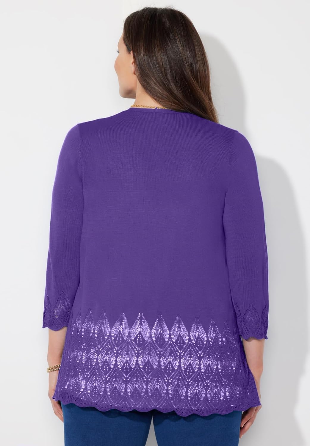 This cardigan has the delicate touch of a pointelle chevron stitch. Feminine. Fashionable. Fabulous. Wear it when you want to feel and look extra special. Perfect with your favorite bottoms, whether Sateen Stretch, Right Fit, Refined Pull-On or beyond. FABRIC: A softly textured, lightweight, cozy, comfy choice for chilly days. FIT: Relaxed silhouette, easy-wearing comfort. Designed with an open front and three-quarter length sleeves. 100% Acrylicbr>Machine washbr>Imported Plus Size Cardiganbr>Regular: 29” length br>Plus Sizes 0X-5Xbr>Catherines