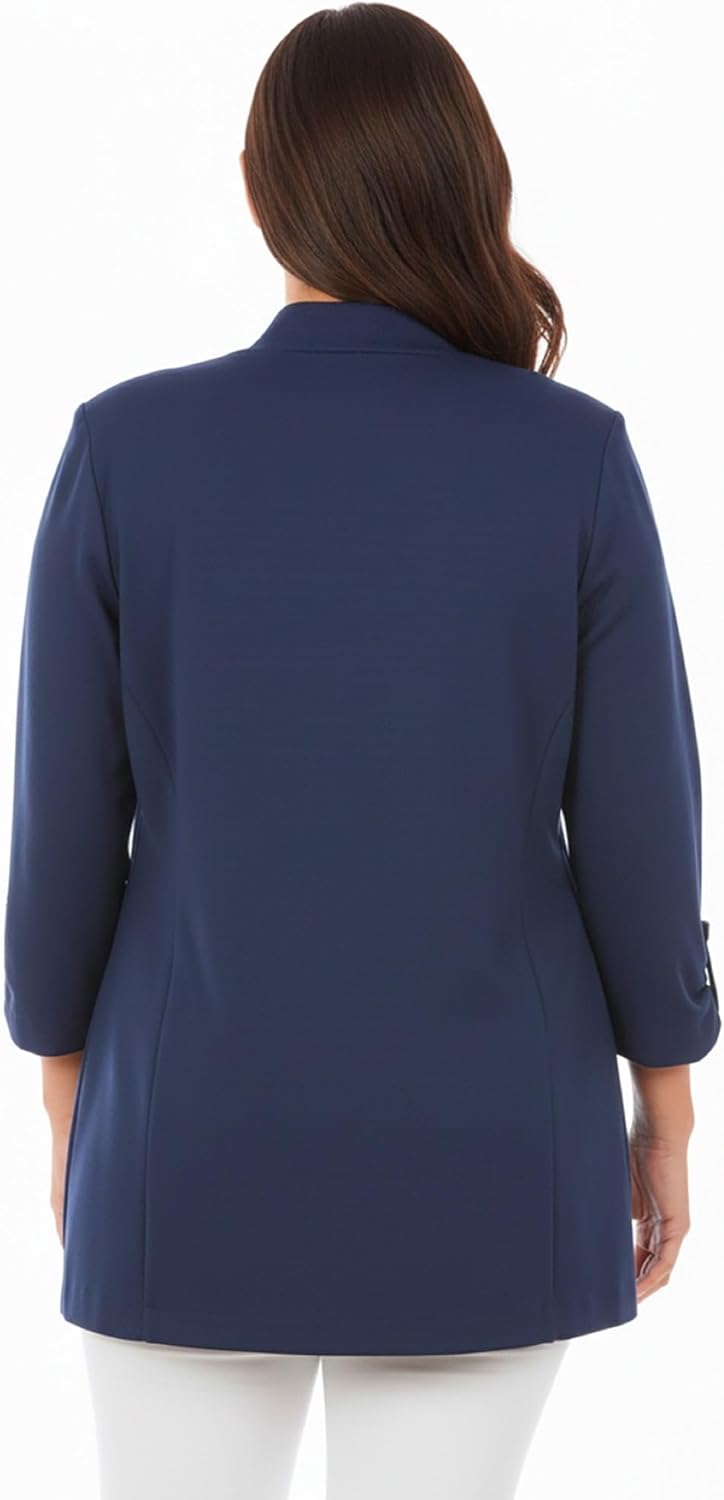 FABRIC: Smooth Ponte knit with soft stretch for comfort, structure, and shape retention.FIT: Tailored silhouette with front and back princess seams. Open front with two gold-tone buttons. Relaxed 3/4 sleeves finished with button tabs. Functional flap pockets.67% Rayon/28% Nylon/5% Spandexbr>Machine Washbr>Imported Plus Size Ponte Blazerbr>Average: 33” lengthbr>Petite: 31” lengthbr>Plus Sizes 0X–6X, Petite Plus Sizes 0XWP-6XWPbr>Catherines